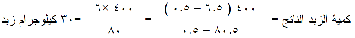 أحسب كمية الزبد 80.5 ٪ دهن الممكن إنتاجها من ٤٠٠ كيلوجرام لبن جاموسى 6.5 ٪ دهن علما بأن ٪ لدهن لبن الخض 0.5%.