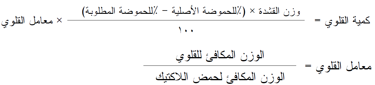 ولابد من حساب كمية القلوي اللازمة لمعادلة جزء من حموضة القشدة المطلوبة للخض كما يلي: