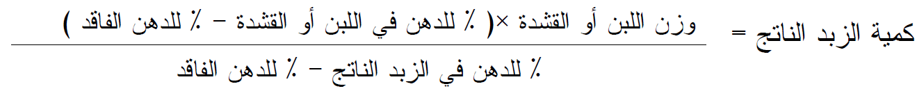 ولحساب الريع الحقيقي تخصم ٢٪ كدهن مفقود من وزن دهن القشدة الداخلة في صناعة الزبد وزن الدهن الصافي الداخل في صناعة الزبد = 100-2= 98 كيلوجرام