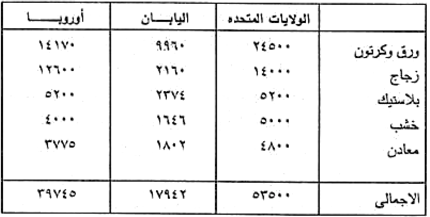 الجدول رقم (1): اجمالي استهلاك مواد التعبئة والتغليف في كل من الولايات المتحدة واليابان واوروبا عام 1985 (الاستهلاك بالألف طن)*.