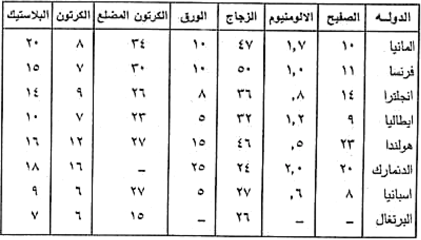 الجدول رقم (2): استهلاك مختلف المواد المستخدمة في صناعة التعبئة والتغليف في دول السوق الاوربية المشتركة (كجم/ فرد/ سنة)*
