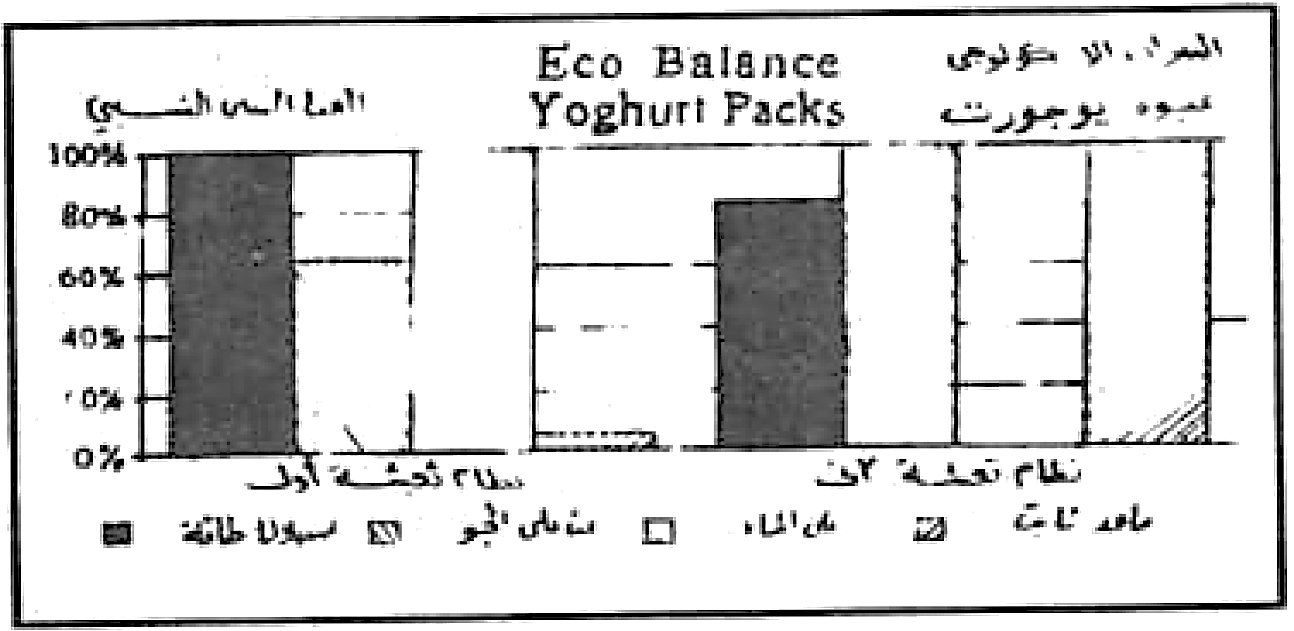 كما ان ميچروس Migros بتعاونه مع المعهد الفيدرالي للتكنولوجي بزيورخ أجرى تقييما لعبوات اللبن المختلفة على أساس الميزان الأيكولوجي Eco Balance آخذا في الاعتبار استهلاك الطاقة والعبء البيئي النسبي على الهواء والماء (شكل رقم 2) .. وطبق ذلك أيضا على أنظمه اليوجورت المختلفة (شكل رقم 3) .. ولم يكتفيMigros بهذا المستوى المتقدم لتقييم العبوات بل طور من نموذج الميزان الأيكولوجي معطيا ما يسمى بنقاط الايكو Eco-points طبقا لنظام متطور اطلق عليه New Eco Balance وفي الحقيقة فإن مشاكل ما بعد استخدام العبوه وكيفيه التخلص من العبوات الفارغة تمثل مشكله عويصة .. والحلول المقترحة في هذا المجال رغم كثرتها لها ايجابياتها وسلبياتها وأحيانا تكلفتها العالية التي تضاف بشكل أو بأخر إلى تكلفه العبوه وهذا الجانب سوف يؤثر مستقبلا تأثيرا كبيرا على منظومه التعبئة والتغليف وهو ما يؤثر الآن بشكل سلبى جدا على هذه المنظومة في الدول المتقدمة صناعيا ويمكن تصور مشاكل العبوات بعد أن ينتهى استخدامها من المستهلك في الاحتمالات الأتية: