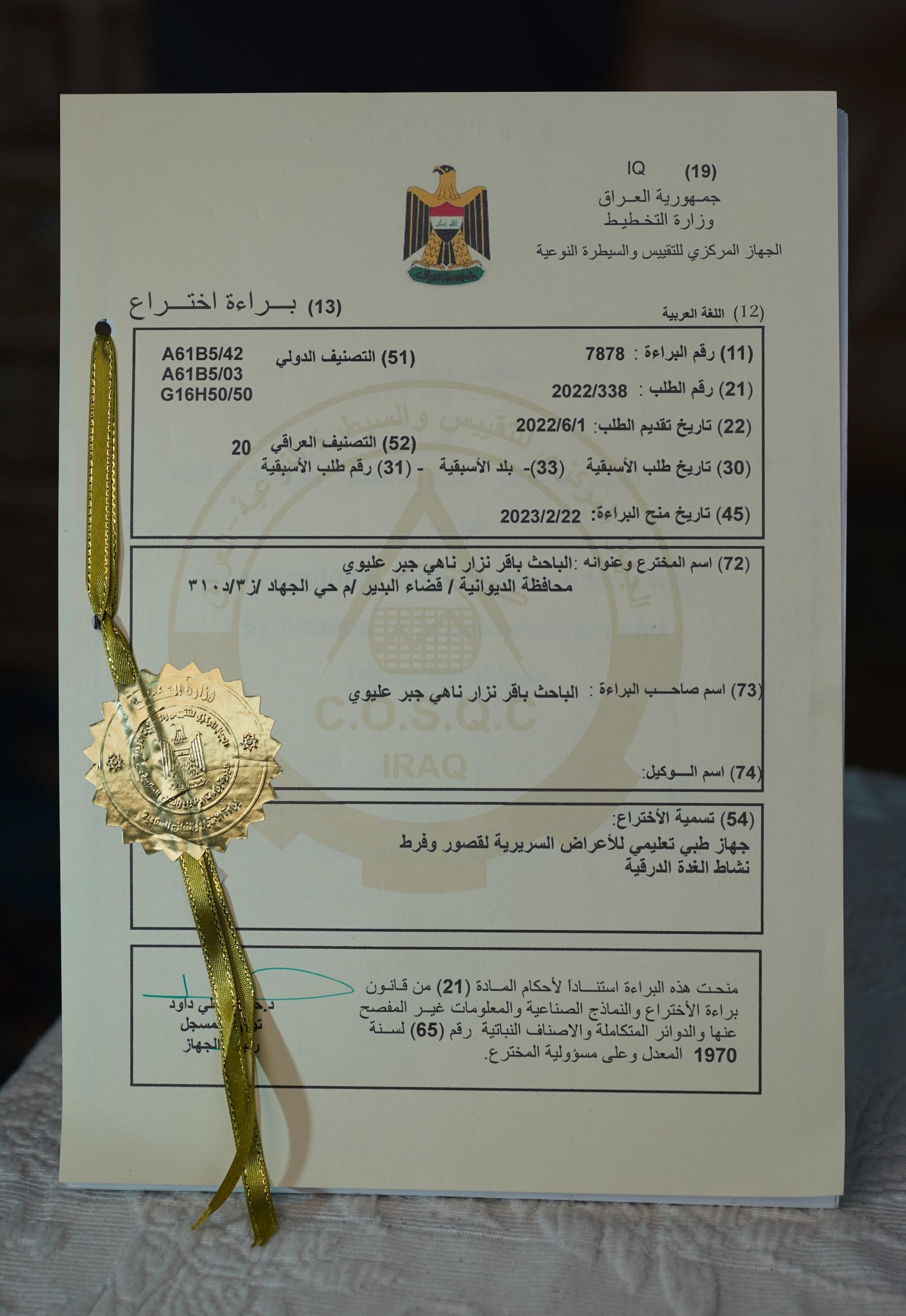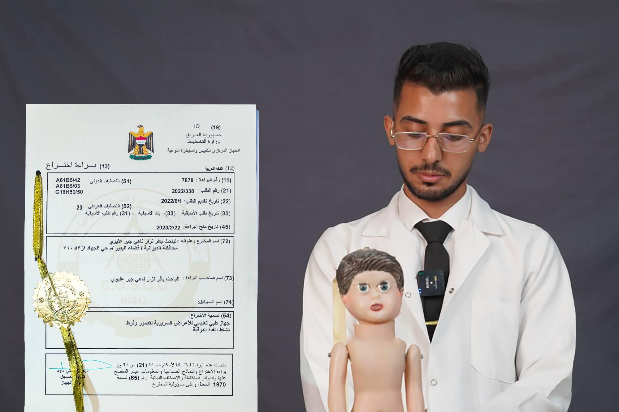 تمكن الطبيب باقر نزار ناهي، أحد المشاركين في مشروع فتية الكفيل الوطني، من الحصول على براءة اختراع لجهاز طبي تعليمي يُحاكي الأعراض السريرية لاضطرابات الغدة الدرقية باستخدام تقنيات الذكاء الاصطناعي. وقال ناهي: "حصلت، من الجهاز المركزي للتقييس والسيطرة النوعية التابع لوزارة التخطيط العراقية، على براءة اختراع لجهاز طبي تعليمي للأعراض السريرية لقصور وفرط نشاط الغدة الدرقية، يمكن استخدامه في تدريب طلبة كليات الطب، والملاكات الصحية". وبين أنَّ "الجهاز عبارة عن دمية (مليكان) تحتوي على حساسات ميكانيكية وحرارية وضوئية، ومبرمجة بوساطة الذكاء الاصطناعي لإظهار الأعراض السريرية بصورة واضحة وعملية"، مشيرًا إلى أنه "يغني عن التدريب السريري على المرضى الذي قد يسبب الإحراج لذويهم، إضافة إلى تقليل الازدحام في المستشفيات العراقية".