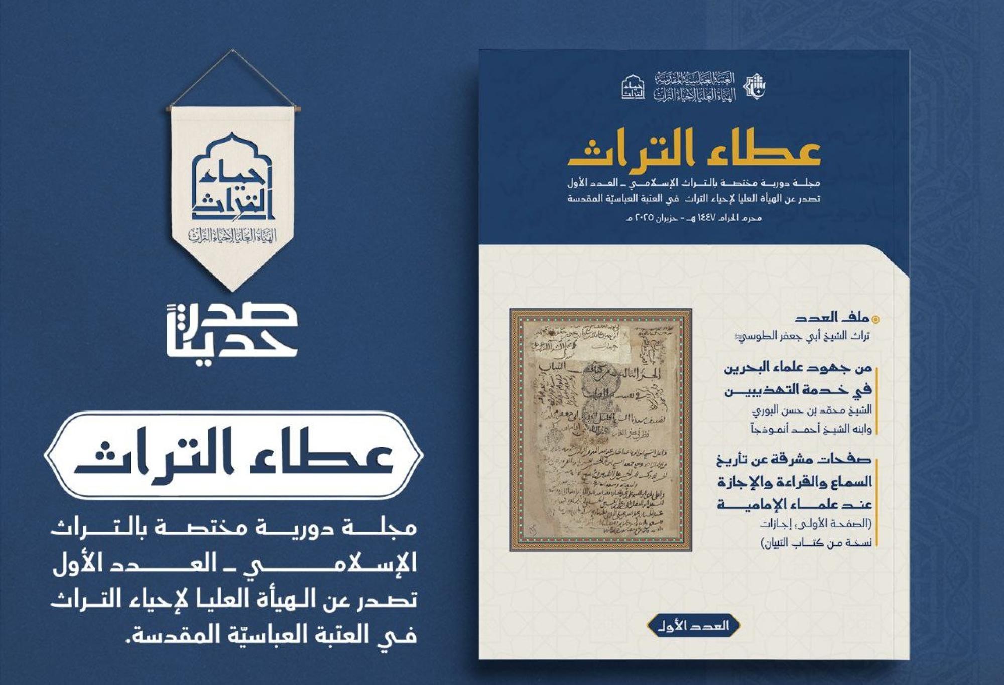 صدر حديثاً عن الهيأة العليا لإحياء التراث في العتبة العباسية المقدسة، العدد الأول من مجلة (عطاء التراث). وتُعنى المجلة بالتراث الإسلامي بوصفها إصداراً دوريًّا متخصصاً يسعى إلى دراسة التراث وتحليله، وتسليط الضوء على أبعاده العلمية والتحقيقية. وتضمن العدد الافتتاحي عشرة أبواب علمية شملت ملف العدد، ومقالات تراثية، ونقد التحقيق، وإطلالة على كتاب، ومغامير التراث، وتحقيق النصوص، وإجازات العلماء، ومراكز تراثية، ولقاءً تراثيًّا، وأخبار التراث.