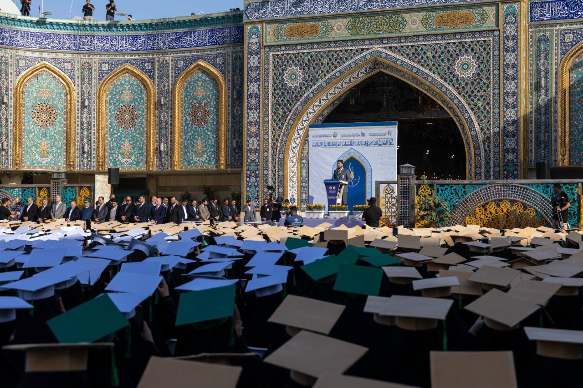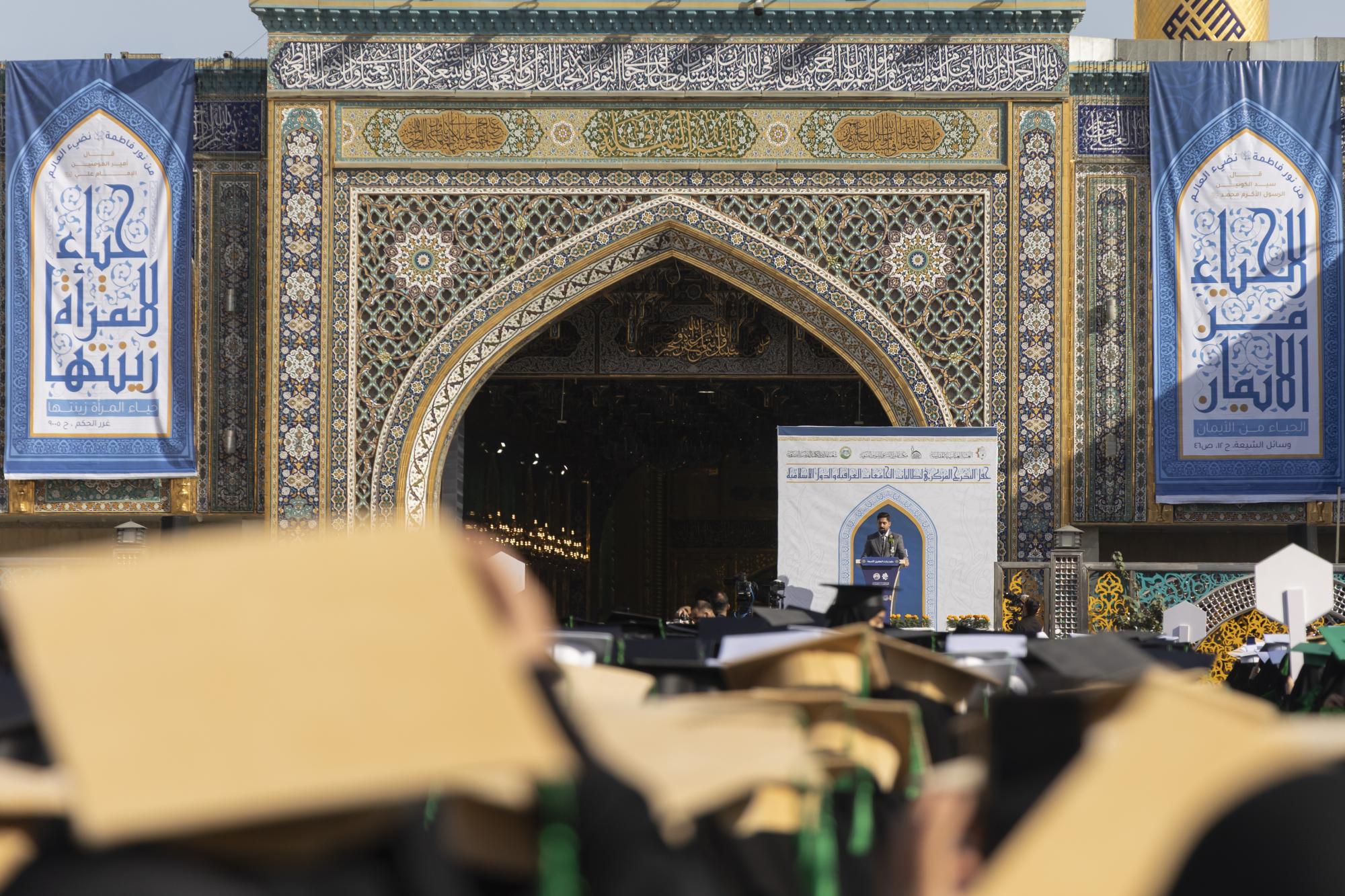 أطلقت العتبة العباسية المقدسة، فعاليات اليوم الثاني من الحفل المركزي لتخرج طالبات الجامعات العراقية والدول الإسلامية بنسخته التاسعة. وتنظم الحفل شعبة مدارس الكفيل الدينية النسوية التابعة لمكتب المتولي الشرعي للشؤون النسوية في العتبة المقدسة، تحت شعار (من نور فاطمة -عليها السلام- نضيء العالم)، بمشاركة 5000 طالبة من مختلف الجامعات العراقية وعدد من الدول العربية والإسلامية. وشهد الحفل حضور الأمين العام للعتبة العباسية المقدسة السيد مصطفى مرتضى آل ضياء الدين، وعدد من أعضاء مجلس إدارتها ورؤساء أقسامها ومسؤوليها. واستُهلت فعاليات اليوم الثاني من الحفل، بفترته الصباحية، بقراءة آيات من الذكر الحكيم بصوت قارئ العتبة المقدسة السيد حيدر جلوخان، ثم ترديد قسم التخرج بالولاء والأمانة لخدمة الوطن أمام مرقد أبي الفضل العباس (عليه السلام) في ساحة باب القبلة، إلى جانب تأدية مراسم زيارته، ومسيرة بين العتبتين المقدستين الحسينية والعباسية، إلى جانب فقرات أخرى. وقال نائب الأمين العام للعتبة المقدسة السيد عباس موسى أحمد: إنّ "العتبة العباسية المقدسة أقامت تحت ظلال قبة أبي الفضل العباس (عليه السلام)، النسخة التاسعة من حفل التخرج المركزي لطالبات الجامعات العراقية دفعة بنات الكفيل، في مشهد يزدان بالفخر والإيمان ويتوج برسالة العلم والعطاء". وأضاف، أنّ "الحفل يأتي ضمن سلسلة البرامج والأنشطة التي تركز عليها العتبة المقدسة في تعزيز انتماء الإنسان لدينه ووطنه وترسيخ قيم الإيمان والمعرفة، وهو يأتي ضمن نهجها في السير على خطى المرجعية الدينية وترجمة توجيهاتها المباركة في احترام الإنسان وربط المنجز العلمي بمنهج أئمة أهل البيت (عليهم السلام)".
