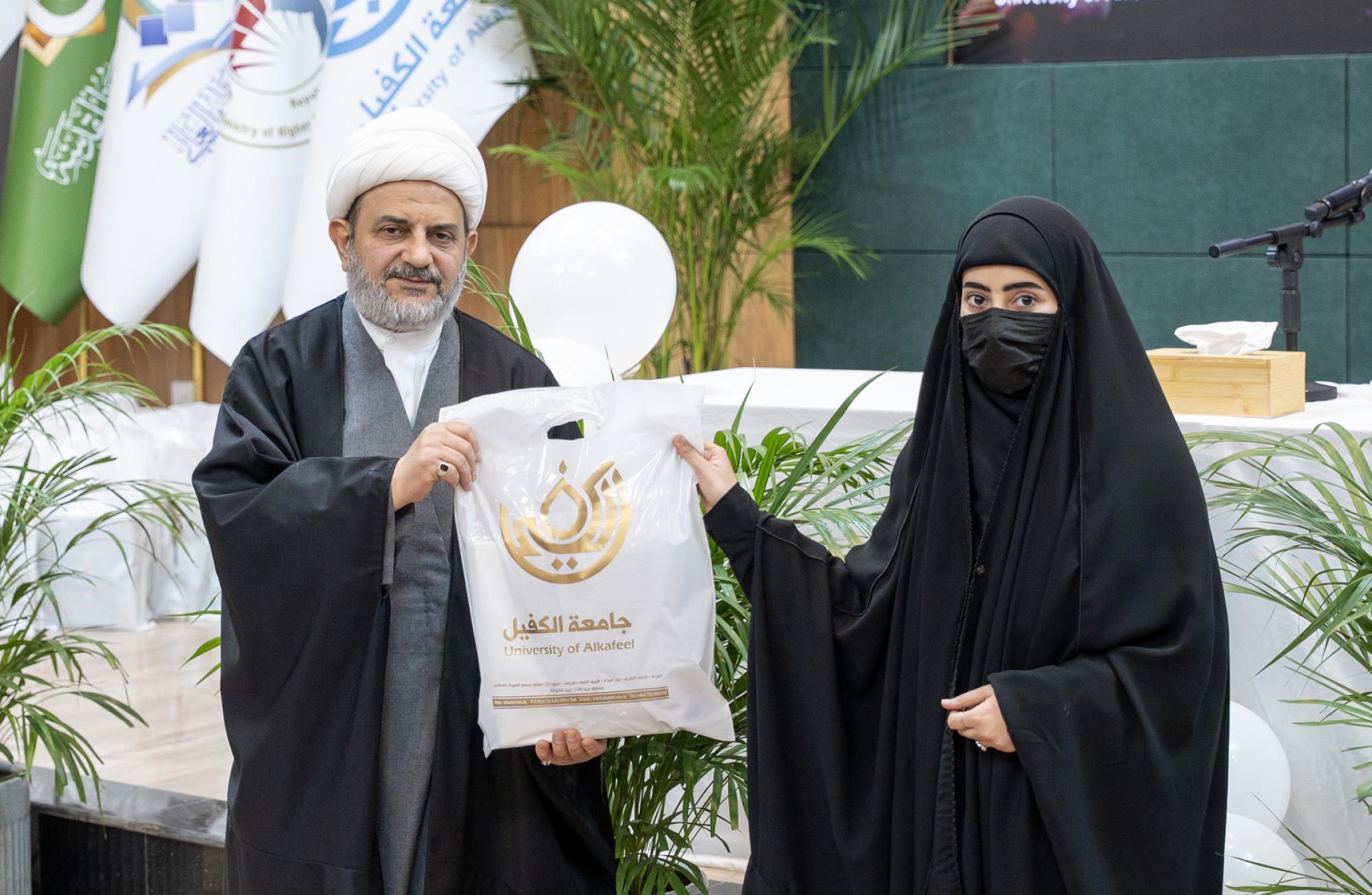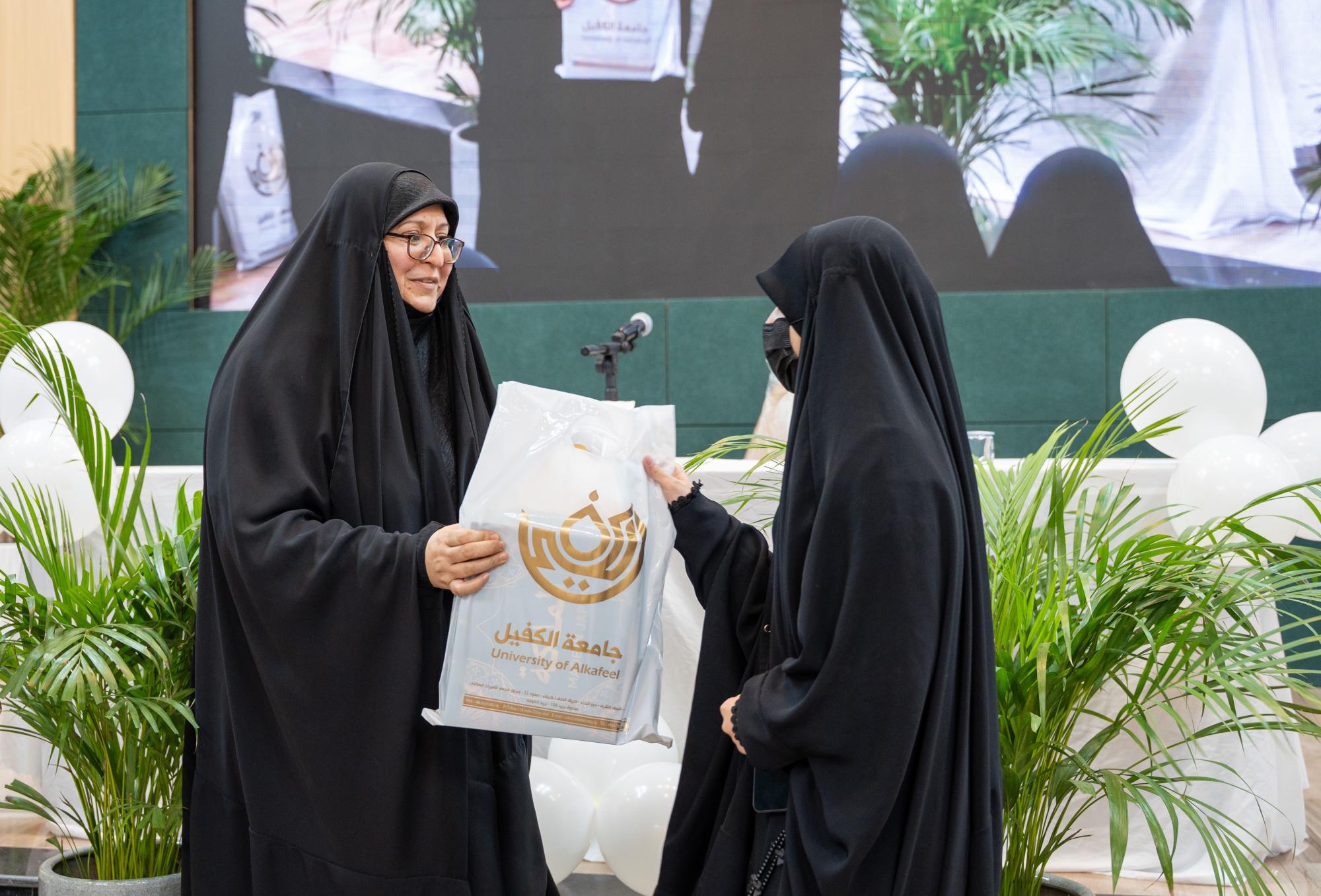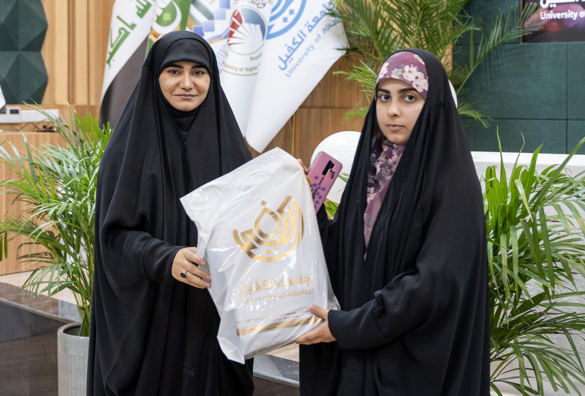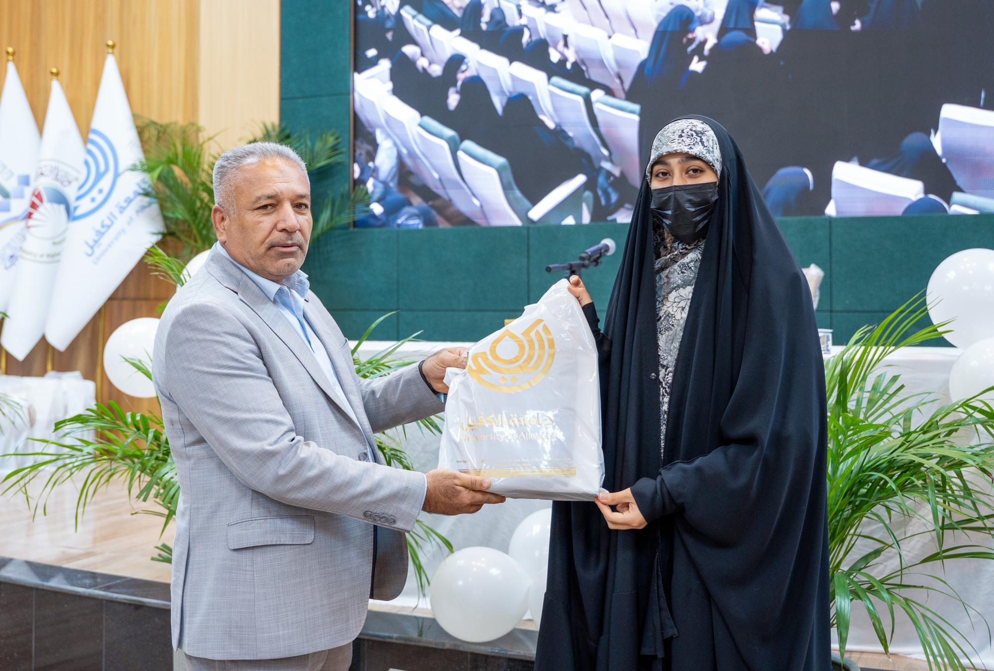 كرمت جامعة الكفيل أكثر من 650 طالبة من طالباتها الملتزمات بالعباءة العراقية في أثناء الدوام الرسمي. واستُهل الحفل الذي أقيم برعاية المتولي الشرعي للعتبة العباسية المقدسة سماحة العلامة السيد أحمد الصافي، بتلاوة آياتٍ من الذكر الحكيم بصوت القارئ علي الزبيدي من معهد القرآن الكريم في النجف الأشرف التابع للعتبة المقدسة أعقبتها كلمة رئاسة الجامعة أُلقاها بالنيابة مدير قسم الإرشاد النفسي والتوجيه التربوي الدكتور حسام علي حسن العبيدي. وأكد العبيدي في كلمته أنَّ هذه المبادرة تمثل نهجًا تربويًّا وأخلاقيًّا ثابتًا تتبناه الجامعة بهدف تعزيز القيم الإسلامية الأصيلة وترسيخ مفاهيم العفاف والاحتشام وبناء شخصية جامعية متوازنة قادرة على مواجهة التحديات الفكرية والثقافية التي يشهدها العصر. وتضمنت فعاليات الحفل محاضرة توعوية قدمتها السيدة أميرة الموسوي من شعبة الخطابة الحسينية النسوية التابعة للعتبة المقدسة استعرضت فيها مكانة الحجاب والعباءة ودورهما في حفظ الكرامة الإنسانية وتعزيز الهوية الإيمانية مؤكدة أهمية الوعي والثبات على القيم في ظل المتغيرات المعاصرة.