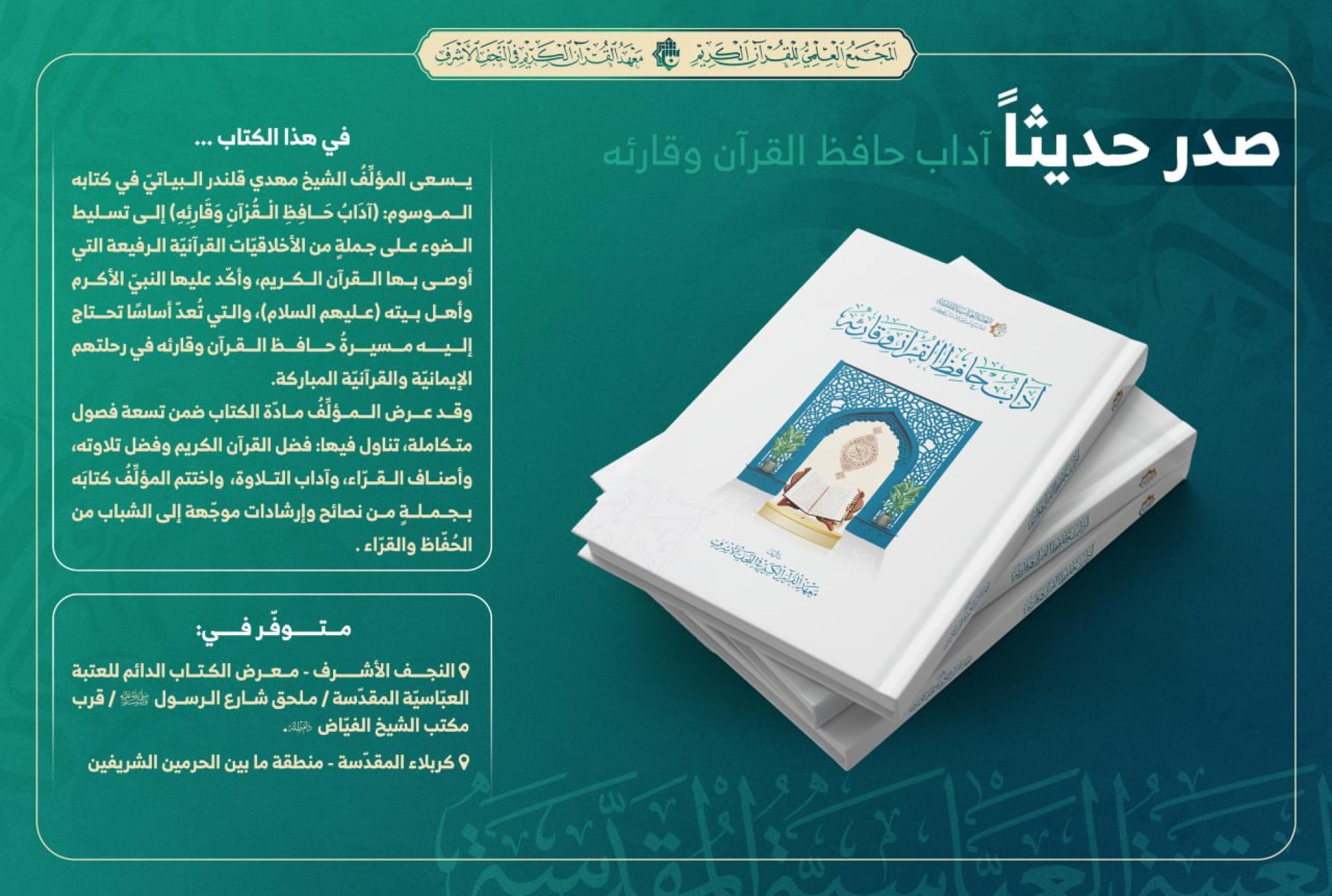 أصدر المجمع العلمي للقرآن الكريم في العتبة العباسية المقدسة، كتاب (آداب حافظ القرآن وقارئه). وأشرف على إصدار الكتاب معهد القرآن الكريم في النجف الأشرف التابع للمجمع، وألفه الشيخ مهدي قلندر البياتي. ويسلط الإصدار الضوء على جملة من الأخلاقيات القرآنية الرفيعة التي أوصى بها كتاب الله العزيز، وأكَّدها النبي الأكرم وأهل بيته (عليهم السلام)، والتي تعد أساسًا تحتاج إليه مسيرة حافظ القرآن وقارئه في رحلتهم الإيمانية والقرآنية المباركة.