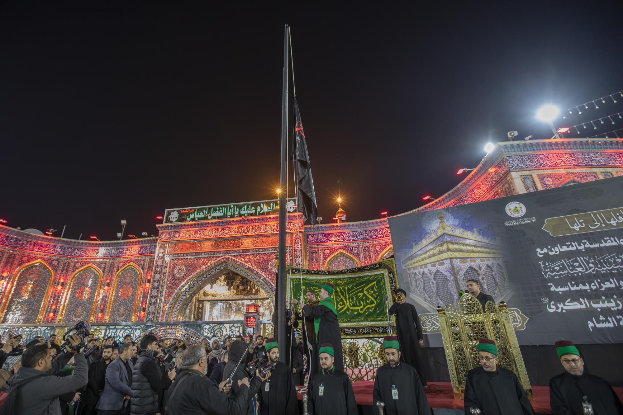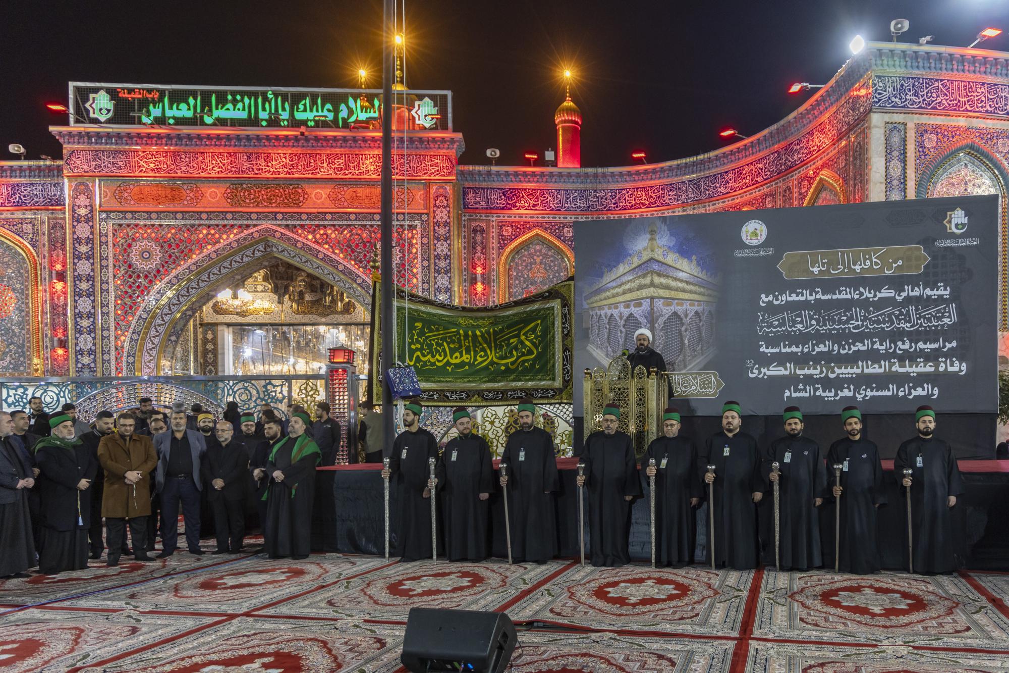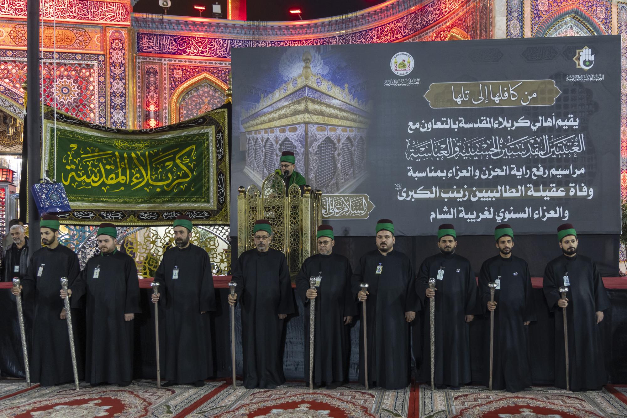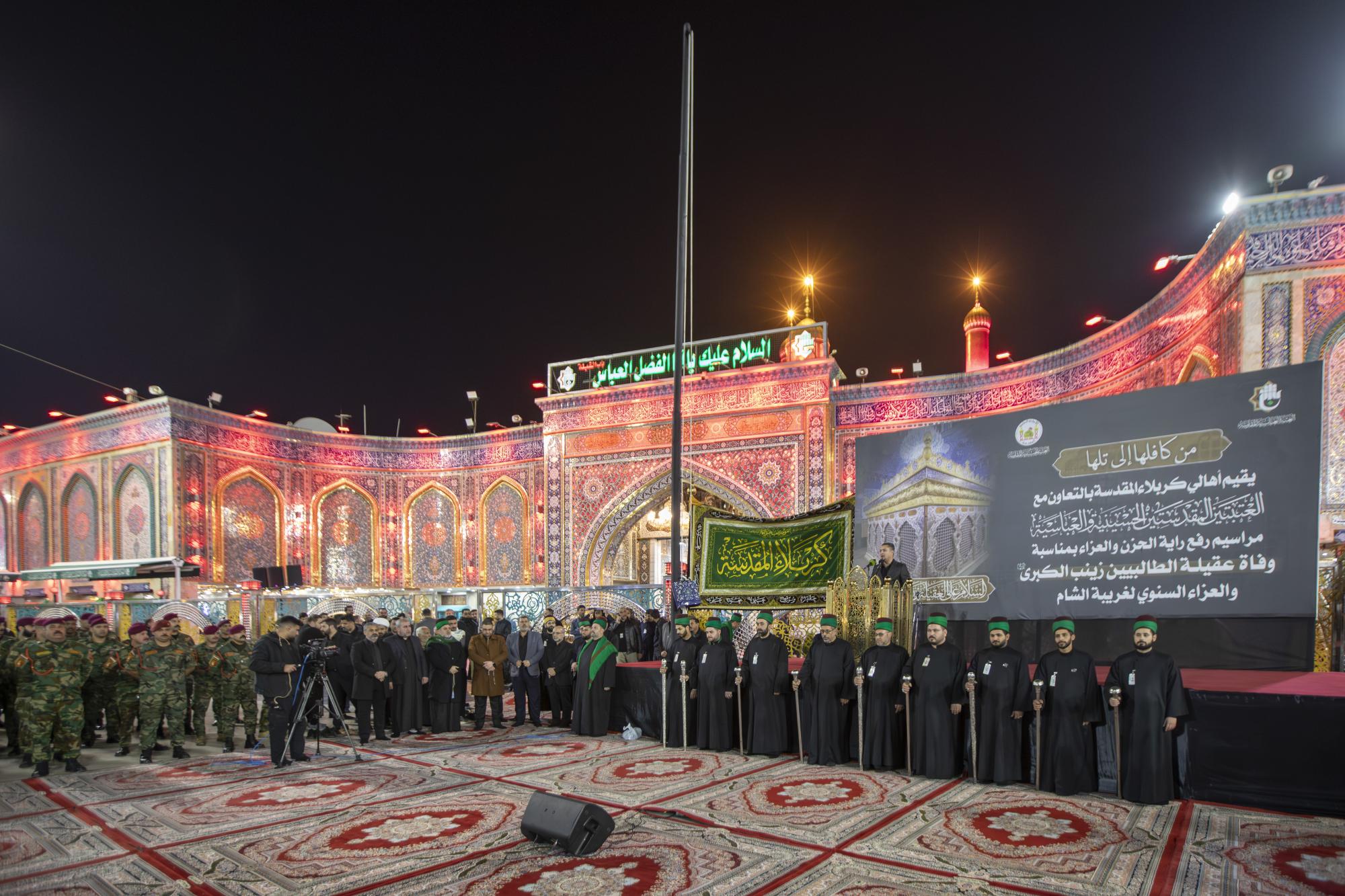 نظّم أهالي مدينة كربلاء، بالتعاون مع العتبتين المقدستين الحسينية والعباسية، مراسم رفع راية العزاء في ذكرى وفاة السيدة زينب الكبرى (عليها السلام). وأُقيمت المراسم في باب القبلة لمرقد أبي الفضل العباس (عليه السلام)، بحضور عددٍ من مسؤولي العتبتين المقدستين، وممثلي أطراف كربلاء ومواكبها وهيآتها، وجمعٍ من الزائرين المعزين. واستُهلّت فعاليات رفع الراية بتلاوة آيات من الذكر الحكيم، أعقبتها كلمة العتبتين المقدستين وأهالي كربلاء، ألقاها الشيخ محمد الكريطي تطرق فيها إلى جوانب من سيرة حياة السيدة الحوراء (عليها السلام) وما تعرضت له على يد الظالمين. وقال رئيس قسم الشؤون الفكرية والثقافية في العتبة العباسية المقدسة السيد عقيل الياسري: إنّ "أهالي مدينة كربلاء وبرعاية العتبتين المقدستين أحيوا ذكرى وفاة السيدة زينب الكبرى (عليها السلام)، عَبرَ تنظيم مراسم رفع راية العزاء المباركة عند بوابة القبلة لمرقد أخيها أبي الفضل العباس (عليه السلام)".