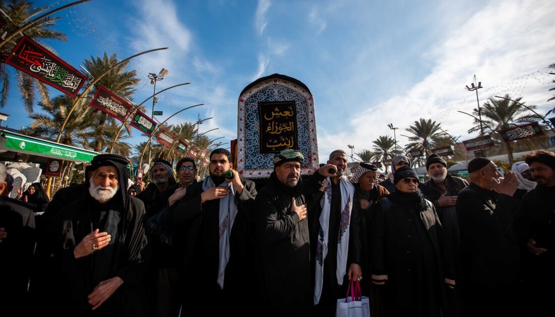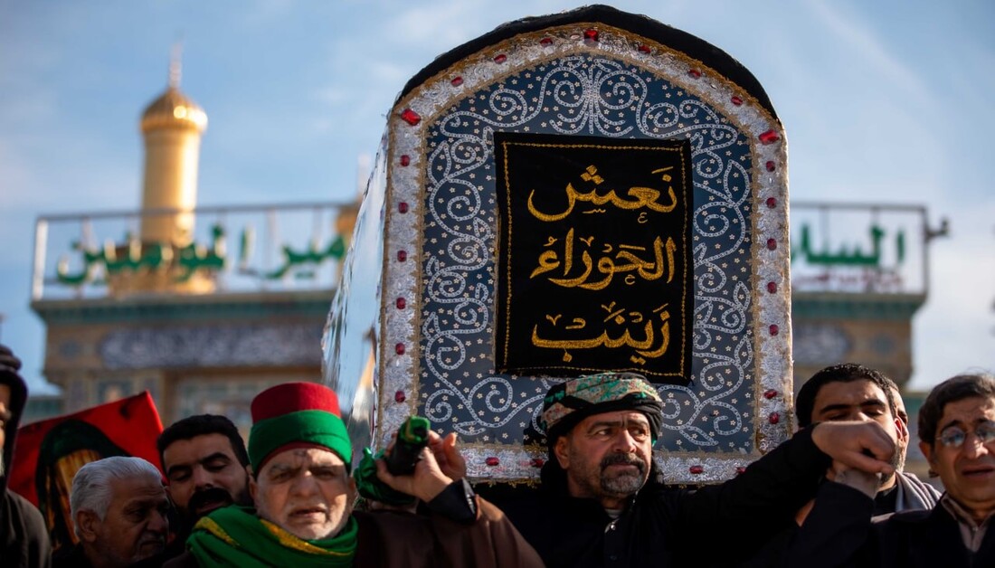 بالصور: بذكرى وفاتها.. جموع كبيرة من المعزين تشارك بتشييع النعش الرمزي للسيدة زينب (ع) في منطقة بين الحرمين