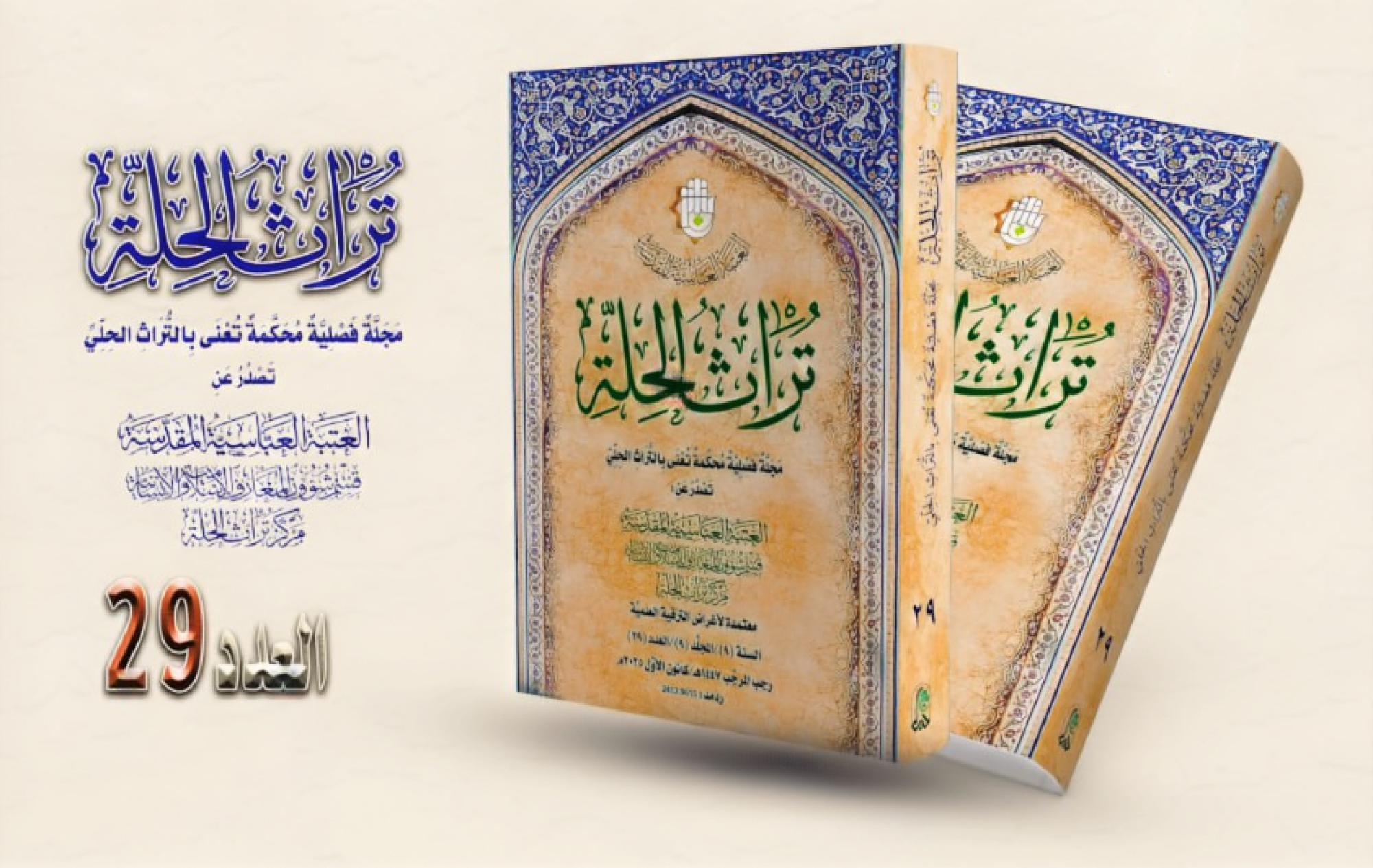 صدر حديثًا عن قسم شؤون المعارف الإسلامية والإنسانية في العتبة العباسية المقدسة، العدد التاسع والعشرين من مجلة تراث الحلة المحكمة. وأشرف على إصدار العدد مركز تراث الحلة التابع للقسم. وضم العدد مجموعة من البحوث والدراسات العلمية المتخصصة، التي تنوعت موضوعاتها لتسلط الضوء على أبعاد مختلفة من التراث الحلي، مما يبرز عمق المدرسة العلمية في مدينة الحلة، وأثرها المعرفي في مختلف الحقول العلمية والإنسانية. واشتمل العدد على بحوث علمية بارزة، من بينها بحث بعنوان (توقفات العلامة في الفتوى بين الفقاهة والتقوى)، وبحث آخر بعنوان (الحلة في عيون الرحالة العرب والأجانب)، فضلًا عن دراسة بعنوان (الأفعال الكلامية المباشرة عند فخر المحققين ت 771هـ، في كتابه غاية السؤول في شرح تهذيب الوصول إلى علم الأصول – دراسة تداولية)، إلى جانب بحوث ودراسات أخرى.