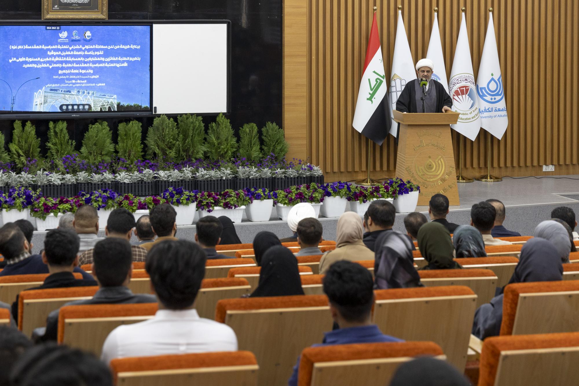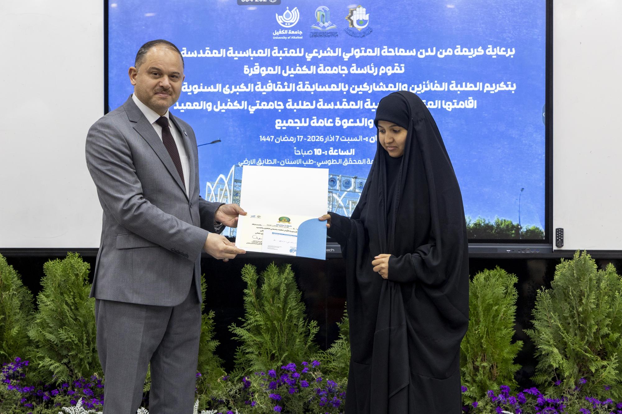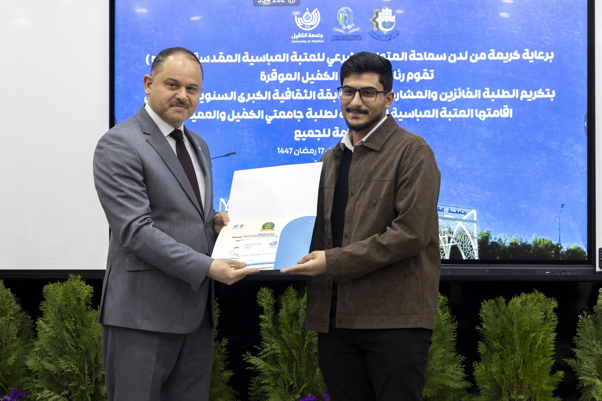 أقامت جامعة الكفيل حفلًا لتكريم الفائزين بفعاليات المسابقة الثقافية السنوية الأولى لطلبة جامعتي الكفيل والعميد. ونُظمت المسابقة برعاية العتبة العباسية المقدسة لطلبة الجامعتين في الرابع عشر من شهر شباط الماضي، في إطار حرصها على تطبيق رؤيتها في إعداد جيل يتمتع بالوعي والمقدرة الثقافية المرتبطة بالمبادئ والقيم الأصيلة وحث الشباب على تنمية ثقافتهم وتعزيز معارفهم. وقال مدير قسم الإرشاد النفسي والتوجيه التربوي في جامعة الكفيل، الدكتور حسام علي حسن العبيدي: إنّ "المسابقة شهدت مشاركة واسعة من طلبة الجامعتين ضمن أجواء تنافسية ثقافية تهدف إلى تنمية الوعي المعرفي، وتعزيز جانب المطالعة بين الطلبة". وأضاف، أنّ "الجامعة نظمت حفلًا لتكريم الطلبة الفائزين في هذه المسابقة السنوية التي أُقيمت هذا العام للمرة الأولى" مؤكدًا أنّ "اللجنة المشرفة على المسابقة بذلت جهودًا كبيرة لتحقيق أهداف المسابقة وتوفير الأجواء المناسبة لضمان نجاحها".