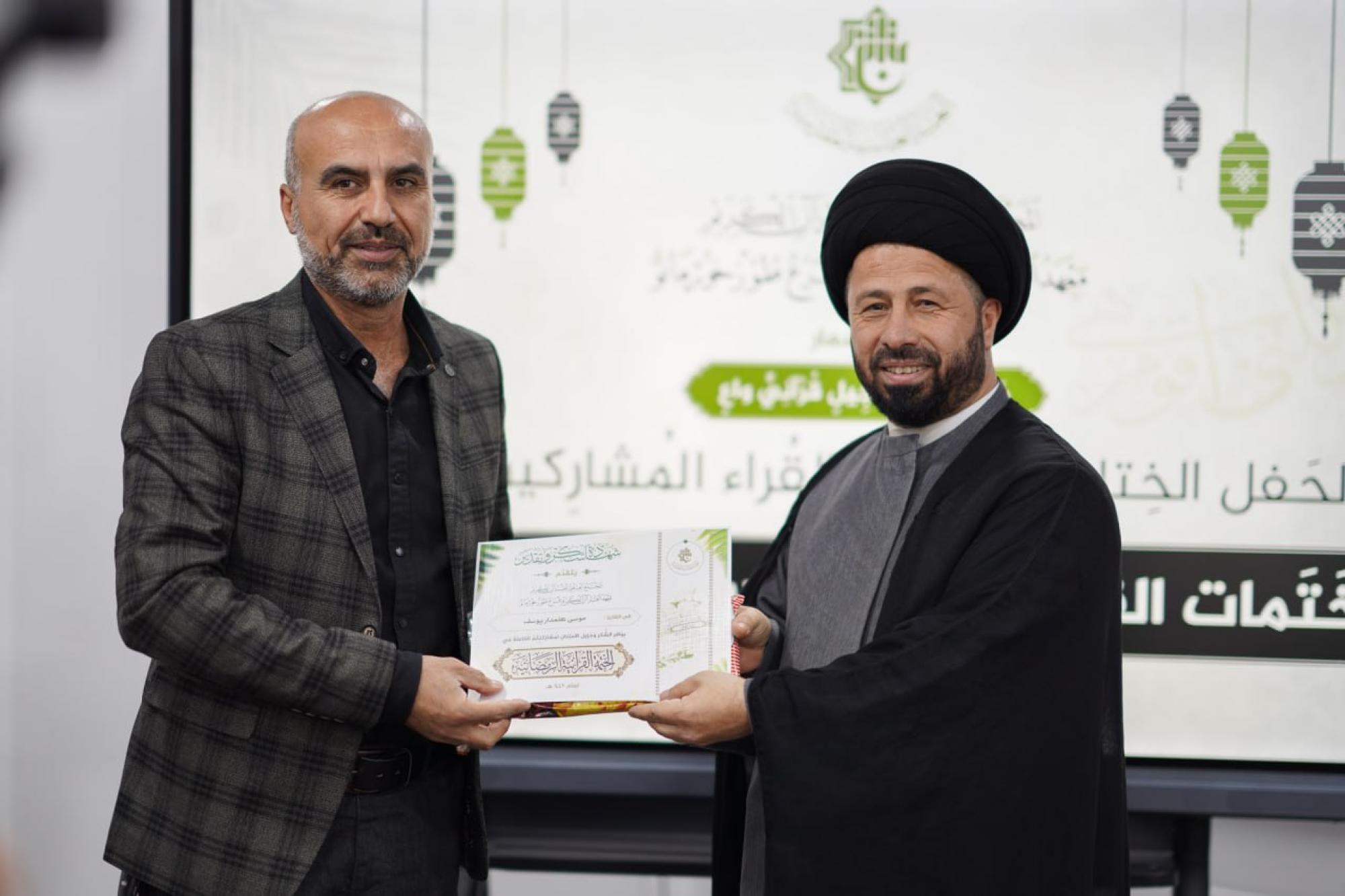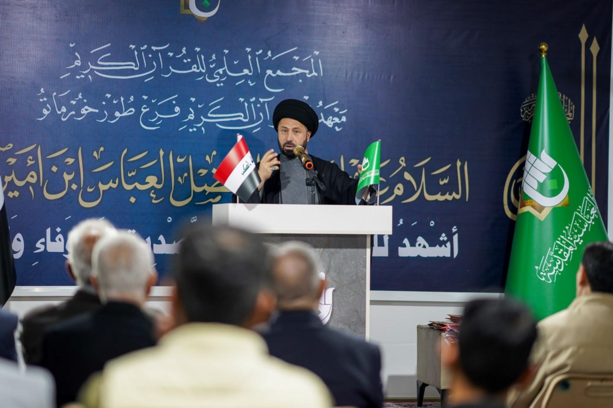 احتفى المجمَعُ العلميّ للقرآن الكريم في العتبة العبّاسية المقدّسة بقرّاء الختمات القرآنيّة الرمضانيّة في قضاء طوز خورماتو بمحافظة صلاح الدين. ونظّمَ حفل تكريم القرّاء معهدُ القرآن الكريم في طوز خورماتو التابع للمجمَع. واستُهِلَّ الحفلُ بتلاوة آياتٍ من الذكر الحكيم بصوت القارئ محمد الإماملي، أعقبتها كلمةُ مسؤول المعهد، السيّد حسين الموسوي، الذي أثنى على جهود القرّاء، داعيًا إلى أهميةِ العمل على إعداد جيلٍ قرآنيٍّ واعٍ. وشهد الحفل إلقاء كلمات أشادت بجهود المجمَع العلمي في ترسيخ الثقافة القرآنية ونشرها، واختُتم بتكريم القرّاء بشهادات شكرٍ وتقدير، فضلًا عن هدايا تبركية من مرقد أبي الفضل العباس (عليه السلام)، تثمينًا لعطائهم في خدمة القرآن الكريم.