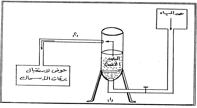 4. توضع في كل حوض (2 × 2 × 0.9 م) عدد ثلاث إناث وعدد خمس ذكور والأحواض معدة بحيث تنزل ماء الصرف من فوق سطح الماء بالحوض.