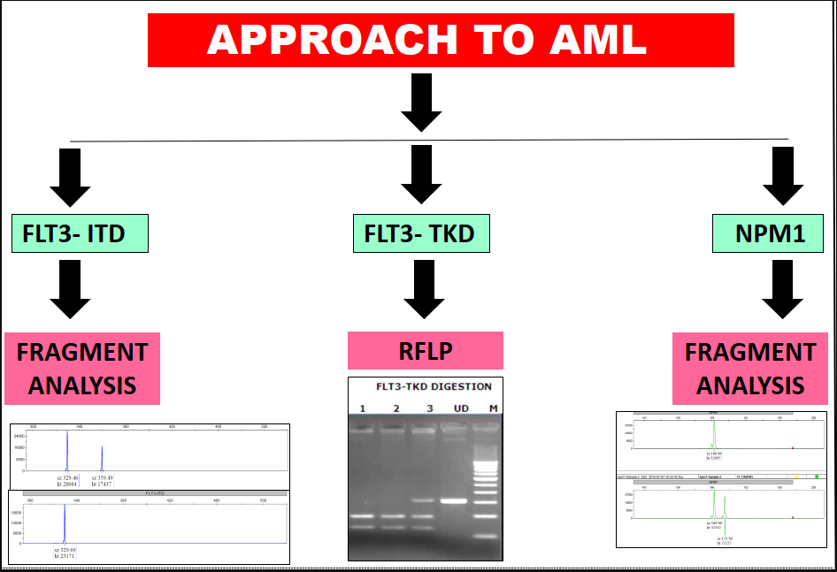 تعد طفرات FLT3 وNPM1 من أكثر التغيرات الجينية شيوعاً في ابيضاض الدم النخاعي الحاد (AML) حيث تؤدي طفرة FLT3 غالباً إلى تنشيط مستمر لمستقبل التيروزين كيناز مما يزيد انقسام الخلايا ويعطي إنذاراً أسوأ في حين أن طفرة NPM1 ترتبط عادةً بانتقال بروتين النوكليوفوسفمين من النواة إلى السايتوبلازم وتعد في غياب FLT3 من المؤشرات الجيدة نسبياً للتشخيص ويستخدم تحديد هاتين الطفرتين في تقييم الإنذار واختيار العلاج الموجه مثل مثبطات FLT3.