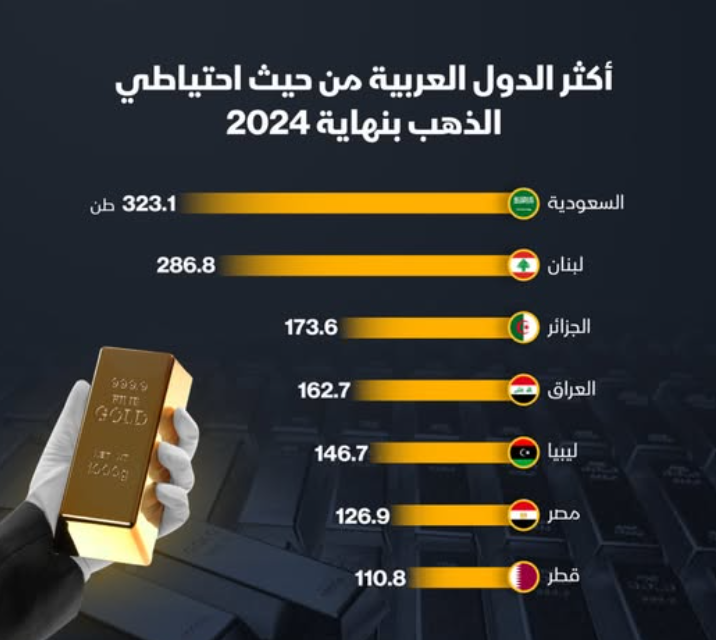 تصدرت المملكة العربية السعودية قائمة الدول العربية بحيازة الذهب خلال عام 2024، تلتها لبنان، ثم الجزائر. جاء العراق في المركز الرابع عربياً، بينما ليبيا في المرتبة الخامسة، فيما احتلت مصر المركز السادس تلتها قطر.