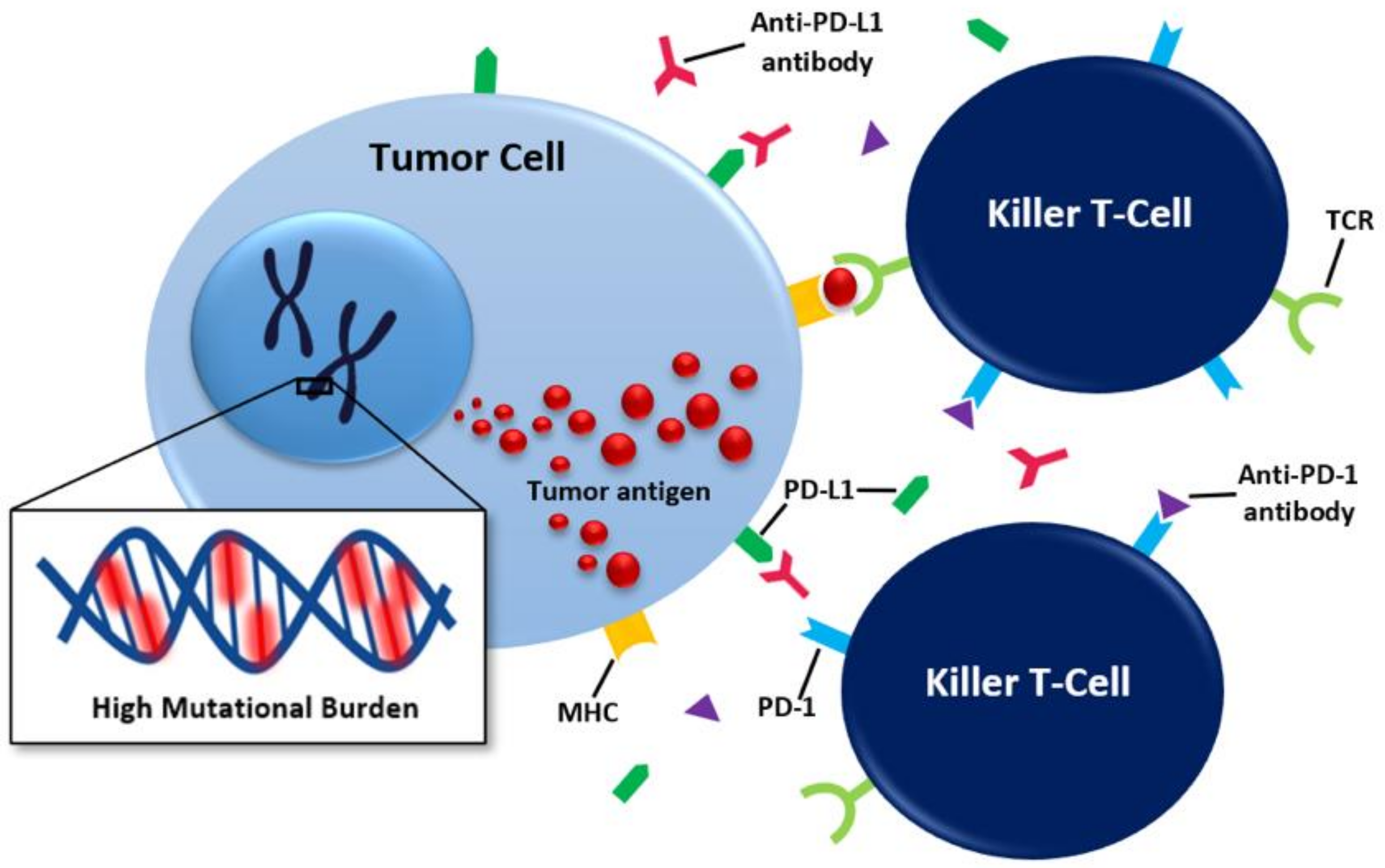 مقياس لعدد الطفرات الجسدية في الحمض النووي المشفر للبروتينات داخل الورم ويعبر عنه بعدد الطفرات في كل Megabase. يُحسب باستخدام تقنيات تسلسل الجينوم مثل Whole Exome Sequencing ويشمل طفرات قد تؤدي إلى تغير في تركيب البروتين. تبرز أهميته في كونه مؤشر على استجابة الورم للعلاج المناعي حيث إن ارتفاعه يعني وجود مستضدات جديدة أكثر (neoantigens) قد تحفز الجهاز المناعي مما يعزز فعالية مثبطات PD-1/PD-L1.يعد TMB ≥10 mut/Mb مرتفع لكن تفسيره يكون غالباً مع مؤشرات أخرى مثل MSI…