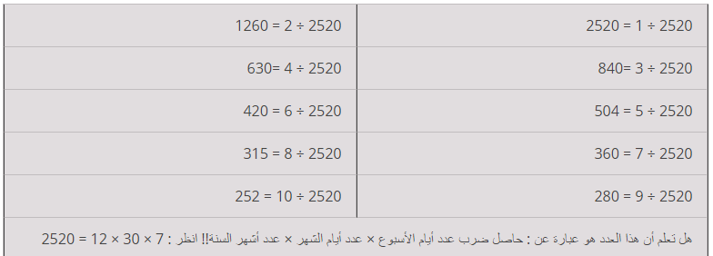 2520 هو أصغر رقم يقبل القسمة على الأرقام من 1 إلى 10 ويكون الناتج رقم صحيح دون كسور: