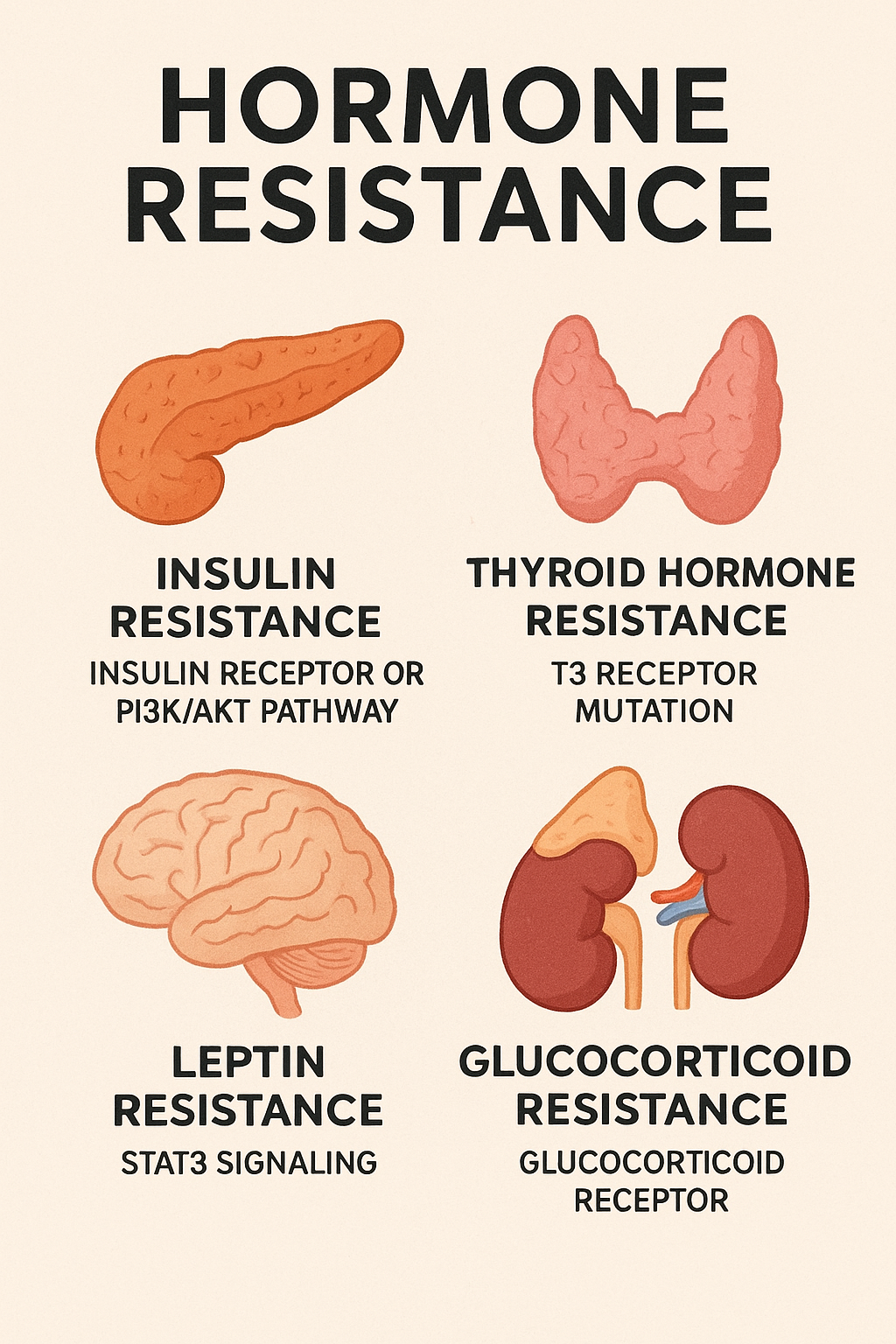 حالة تفشل فيها الخلايا المستهدفة في الاستجابة الطبيعية للهرمونات رغم وجودها بمستويات كافية أو مرتفعة وتحدث نتيجة خلل في المستقبلات أو في مسار الإشارة داخل الخلية بعد ارتباط الهرمون بالمستقبل أو بسبب انخفاض عدد المستقبلات الناتج عن التعرض المزمن للهرمون كما في مقاومة الإنسولين التي تتضمن اضطراب في مستقبل الإنسولين أو في المسار الإشاري PI3K/Akt وتشمل أمثلة أخرى مقاومة هرمون الغدة الدرقية بسبب طفرات في مستقبل T3، ومقاومة اللبتين الناتجة عن خلل في إشارات…