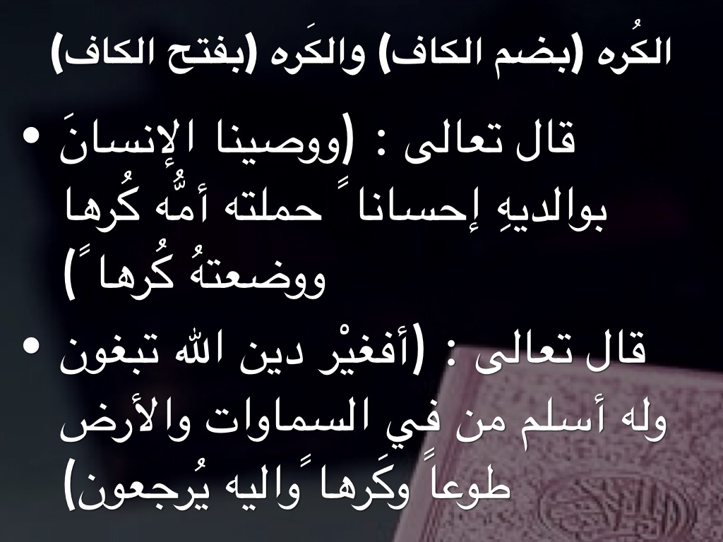 ما الفرق بين (الكَره) و (الكُره) ؟ : لا فرق بين اللفظتين وتعنيان الإباء والمشقة .ولكن لفظة (كَرهاً ) بفتح الكاف يظهر أنه المشقة التي لا يريدها صاحبها ، مثل قوله تعالى :{وَلِلَّهِ يَسْجُدُ مَنْ فِي السَّمَاوَاتِ وَالْأَرْضِ طَوْعًا وَكَرْهًا} [الرعد : 15].أما (كُرهاً) بضم الكاف ، تتضمن المشقة ولكن صاحبها رغم مشقتها يفعلها وهو راض عنها ، مثل المرأة ، وقتال المجاهد ، يقول تعالى :{وَوَصَّيْنَا الْإِنْسَانَ بِوَالِدَيْهِ إِحْسَانًا حَمَلَتْهُ أُمُّهُ كُرْهًا وَوَضَعَتْهُ كُرْهًا} [الأحقاف : 15].