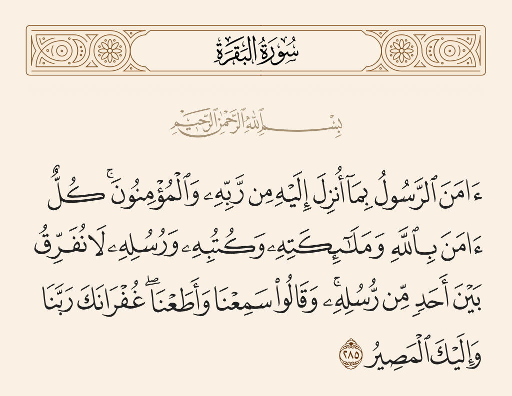 قال تعالى: {آمَنَ الرَّسُولُ بِمَا أُنْزِلَ إِلَيْهِ مِنْ رَبِّهِ وَالْمُؤْمِنُونَ كُلٌّ آمَنَ بِاللَّهِ وَمَلَائِكَتِهِ وَكُتُبِهِ وَرُسُلِهِ لَا نُفَرِّقُ بَيْنَ أَحَدٍ مِنْ رُسُلِهِ وَقَالُوا سَمِعْنَا وَأَطَعْنَا غُفْرَانَكَ رَبَّنَا وَإِلَيْكَ الْمَصِيرُ} [البقرة: 285].