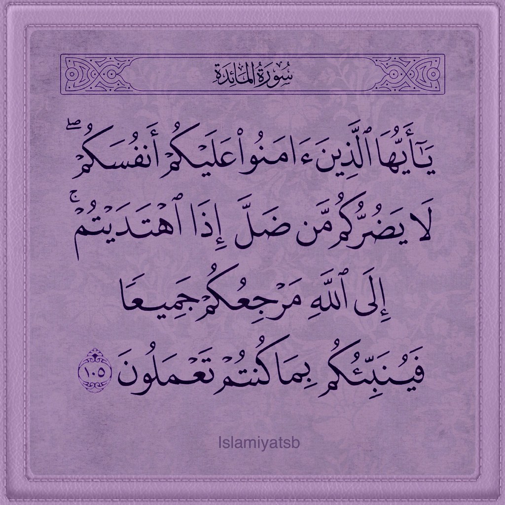 "الآية تأمر المؤمنين أن يلزموا أنفسهم، ويلازموا سبيل هدايتهم ولا يوحشهم ضلال من ضل من الناس فإنّ الله سبحانه هو المرجع الحاكم على الجميع حسب أعمالهم ... فعلى المؤمن أن يشتغل بما يهم نفسه من سلوك سبيل الهدى، ولا يهزهزه ما يشاهده من ضلال الناس وشيوع المعاصي بينهم ولا يشغله ذلك ولا يشتغل بهم فالحق حق وإن ترك والباطل باطل وإن أخذ به" * تفسير الميزان.