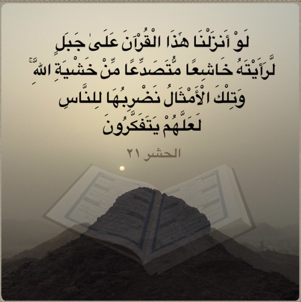 قال تعالى : { لَوْ أَنْزَلْنَا هَذَا الْقُرْآنَ عَلَى جَبَلٍ لَرَأَيْتَهُ خَاشِعًا مُتَصَدِّعًا مِنْ خَشْيَةِ اللَّهِ وَتِلْكَ الْأَمْثَالُ نَضْرِبُهَا لِلنَّاسِ لَعَلَّهُمْ يَتَفَكَّرُونَ } [الحشر : 21].