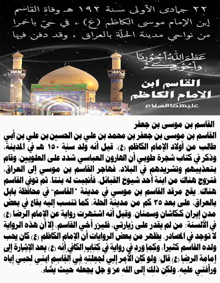 عظم الله اجوركم بأستشهاد القاسم بن الامام الكاظم(ع)