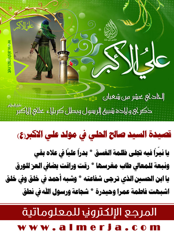 علي بن الحسين بن علي بن أبي طالب (33 - 61 هـ) الشهير بـ"علي الأكبر"، والده الإمام الحسين عليه السلام، من شهداء واقعة الطف حيث استشهد يوم عاشوراء بعد أن قاتل قتالاً شديداً، وذُكر أنه أوّل شهيد من بني هاشم، ودفن إلى جوار أبيه في حرم الإمام الحسين في كربلاء. وقد وصفه الإمام الحسين(ع) بأشبه الناس خَلقاً وخُلقاً ومنطقاً برسول الله (ص).