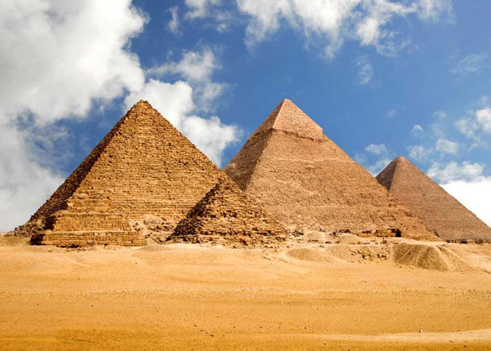 اهرامات مصر: يعتبر بناء الأهرامات مسألة غامضة وتقع بالقرب من الجيزة وهي من عجائب الدنيا القديمة استغرق بناء الأهرامات ما يقارب20عاماً على أيدي100ألف رجل كما ذكر المؤرخ اليوناني هيرودوت هنالك ثلاثة أهرامات الهرم الأكبر يعتبر هرم خوفو أطول هيكل من صنع الإنسان حتّى عام 1800م ويتكون مما يقارب 2.3 مليون كتلة حجرية والتي تزن تقريباً 5.75 مليون طن. هرم خفرع بني على يد خفرع ابن خوفو وهو الهرم الثاني. هرم منكرع يعتبر أصغر الأهرامات الثلاثة حجماً، وقد تم بناؤه على إرتفاع 67 متراً على يد ابن خفرع منكرع .