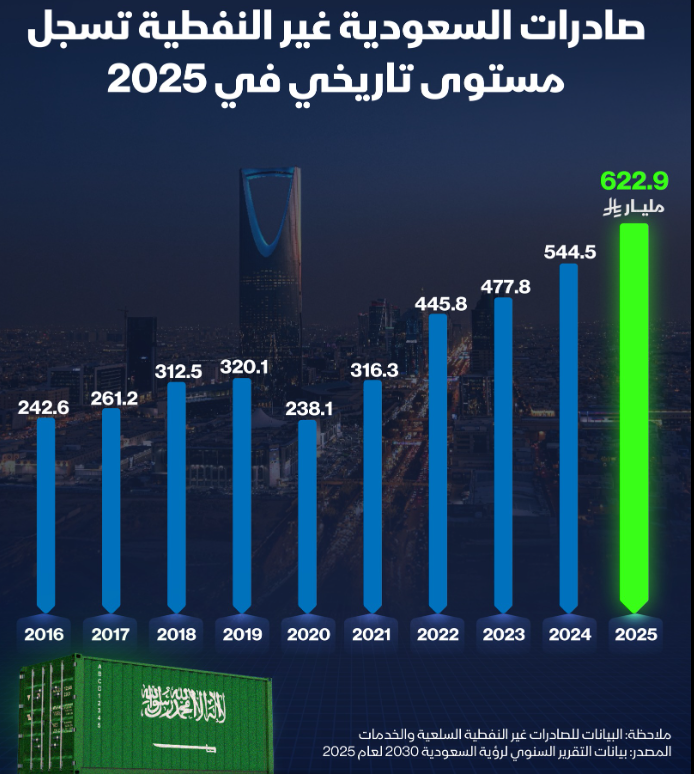 صادرات السعودية غير النفطية في 2025 عند أعلى مستوياتها التاريخية بقيمة تتجاوز 622 مليار ريال، بحسب التقرير السنوي لرؤية السعودية 2030 للعام 2025.