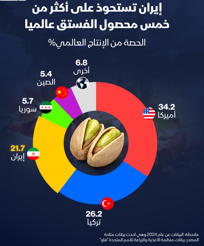 إيران تستحوذ على أكثر من خمس محصول الفستق عالمياً في المرتبة الثالثة بعد امريكا وتركيا.