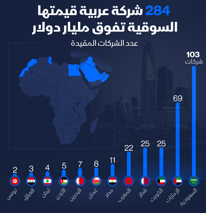 284 شركة عربية قيمتها السوقية تفوق مليار دولار.. #السعودية في الصدارة بـ103 شركات، تليها #الإمارات بـ69 شركة، و #المغرب الخامس بضعف عدد الشركات المليارية في #مصر صاحبة المركز السادس.