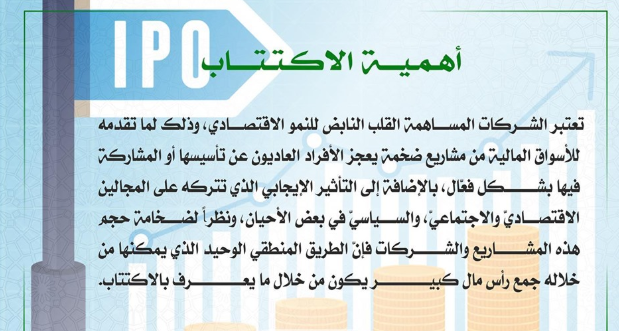 أهمية الاكتتاب : تعتبر الشركات المساهمة القلب النابض للنمو الاقتصادي ، وذلك لما تقدمه للأسواق المالية من مشاريع ضخمة يعجز الافراد العاديون عن تأسيسها أو المشاركة فيها بشكل فعال ، بالاضافة الى التأثير الايجابي الذي تتركه على المجالين الاقتصادي والاجتماعي ، والسياسي في بعض الاحيان ، ونظراً لضخامة حجم هذه المشاريع والشركات فان الطريق المنطقي الوحيد الذ يمكنها من خلاله جمع رأس مال كبير يكون من خلال ما يعرف بالاكتتاب .
