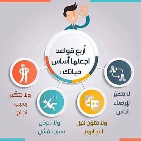 أربع قواعد اجعلها اساس في حياتك : 1ـ لا تتغير لإرضاء الناس ، 2ـ لا تتلون لنيل اعجابـهم ، 3ـ لا تتبدل وتيأس بسبب فشل ، 4ـ لا تتكبر بسبب نجاح .