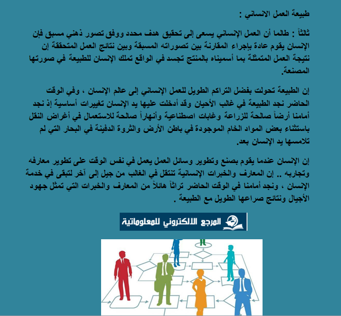 والخلاصة لنُنجز أي عملية عمل لابد لنا أولاً من توفر العنصر الذاتي وهو العمل الإنساني وثانياً العناصر المادية الموضوعية (وسائل الإنتاج) والتي تشمل وسائل العمل ومواضيع العمل ومتى توفرت هذه العناصر مجتمعة يكون المنتج الحصيلة والنتيجة الطبيعية لعملية العمل إلا أن درجة إشباع الحاجات الإنسانية تتوقف على مستوى إنتاجية العمل ،وفي الوقت الذي يعمل فيه الإنسان على تحقيق المنتج لإشباع حاجاته فهو يسعى بصورة دائمة إلى زيادة عدد المنتجات ومن أجل تحقيق هذا الغرض فإن الإنسان يعمل على الدوام لتطوير العمل وتحسينه.