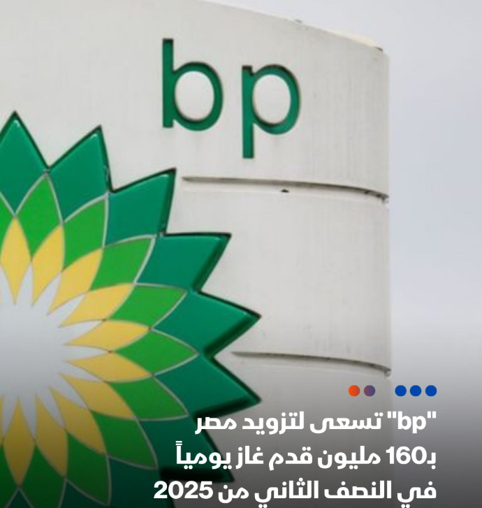 - تسعى شركة "BP" البريطانية لزيادة إنتاج الغاز في مصر بنحو 160 مليون قدم مكعبة يومياً في النصف الثاني من العام الجاري. - الزيادة ستأتي من بئرين في منطقتي امتياز كينج مريوط والفيوم بالمياه العميقة بالبحر المتوسط - زيادة إنتاج الغاز ستخفف الضغوط الواقعة على الحكومة المصرية للاستيراد لسد فجوة بين العرض والطلب في الصيف.