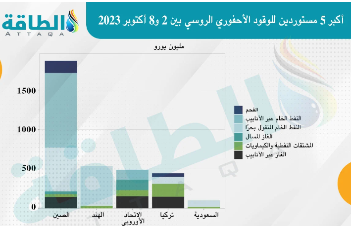 حلّت الصين على رأس قائمة أكبر مستوردي الوقود الأحفوري الروسي خلال الأسبوع الماضي بين 2 و8 أكتوبر/تشرين الأول الجاري (2023)، تلتها الهند والاتحاد الأوروبي وتركيا والمملكة العربية السعودية.وكان النصيب الأكبر من واردات السعودية لصالح النفط الخام المنقول بحرًا، تليه المشتقات النفطية والكيماويات. جاء هذا في حين واصلت صادرات الوقود الأحفوري الروسي تدفقها إلى الأسواق العالمية، كما حظي الاتحاد الأوروبي بحصة كبيرة منها رغم فرضه عقوبات استهدفت قطاع الطاقة الممول الرئيس لخزينة موسكو.