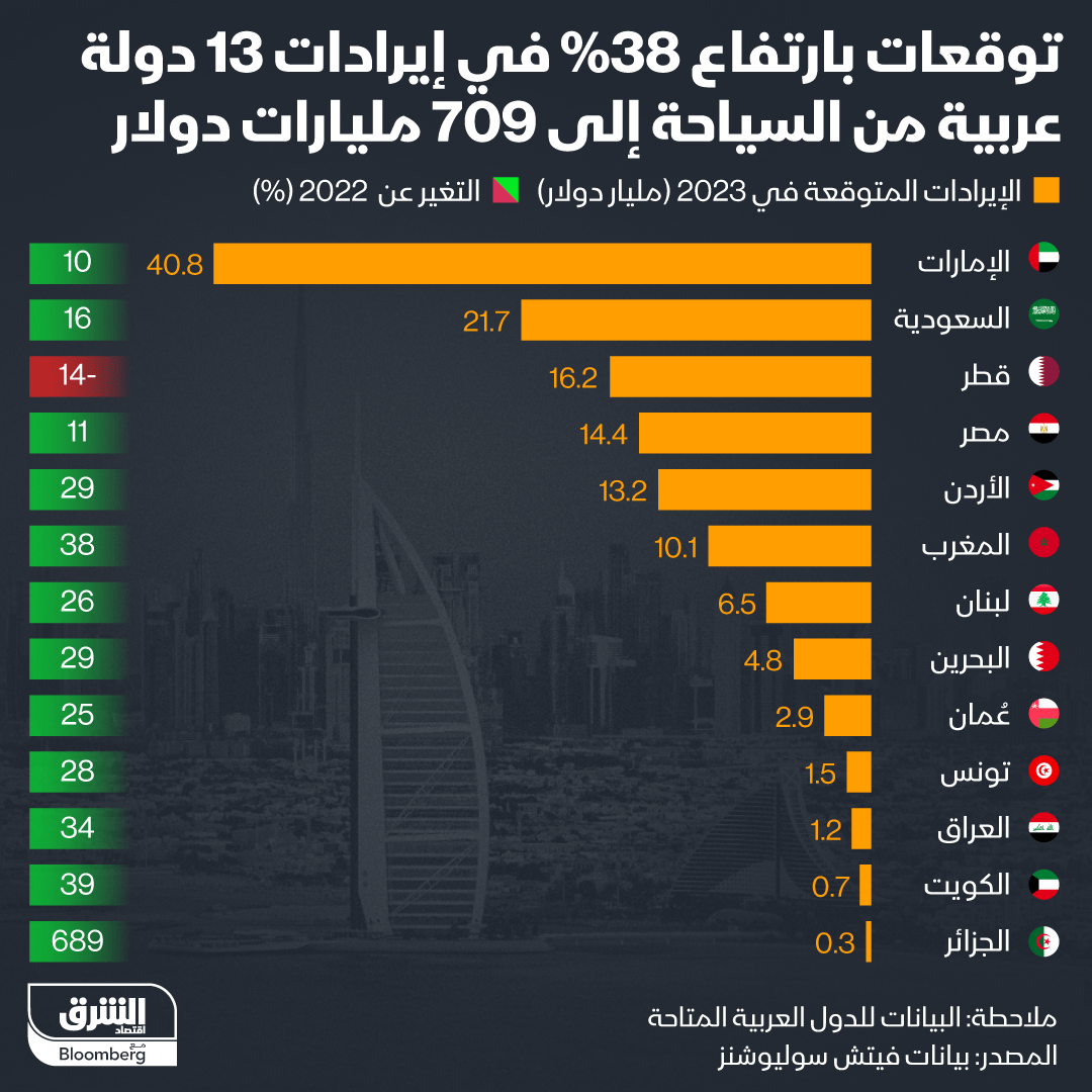 ومن المتوقَّع أن يصل إجمالي إيرادات 13 دولة عربية من السياحة إلى 709 مليارات دولار في 2023 بزيادة 38% عن العام الماضي، وتتصدر الإمارات ترتيب الدول العربية من حيث إيرادات القطاع، ثم السعودية، فيما تأتي مصر في المركز الرابع.