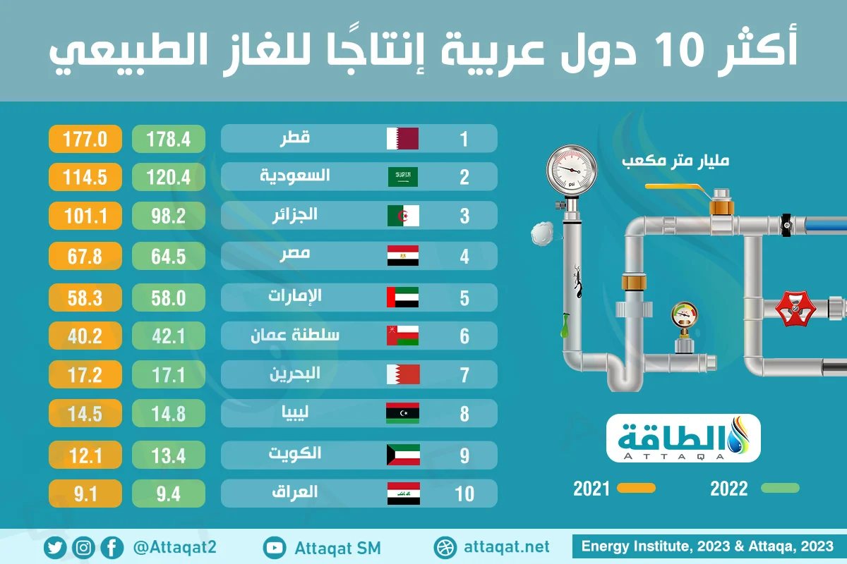 العراق هو عاشر اكبر دولة عربية منتجة للغاز الطبيعي بنحو 9.4 مليار متر مكعب عام 2022 وهو يحرق بقدرها ويستورد مثلها مع ان العراق هو العاشر عالميا من حيث ما يمتلكه من الاحتياطي المؤكد من الغاز الطبيعي !!!
