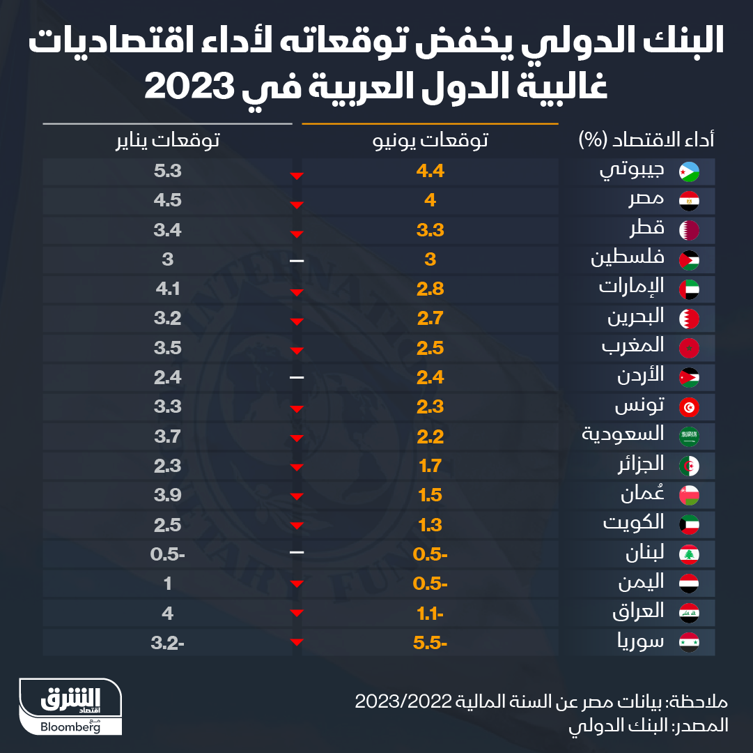 قلّص البنك الدولي تقديراته لنمو 14 اقتصاداً عربياً خلال العام 2023، فيما أبقى على توقُّعاته المنخفضة للنمو في 3 دول عربية، وهي فلسطين، والأردن، ولبنان. بحسب مراجعة شهر يونيو، مقارنة بتقرير يناير الماضي. أرجع البنك الدولي خفض التوقُّعات إلى قرارات خفض إنتاج النفط طوعياً التي أقرتها بعض الدول الأعضاء بتحالف "أوبك+"، وتمتد حتى نهاية 2024، وكذلك الخفض الطوعي الإضافي الذي قدّمته السعودية لمدة شهر اعتباراً من أول يوليو.