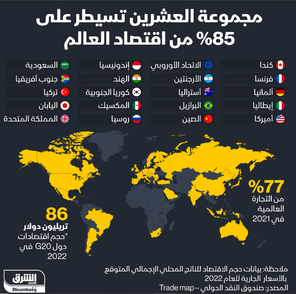 تستحوذ دول مجموعة العشرين على 85% من مجمل الاقتصاد العالمي، حيث تبلغ القيمة الإجمالية لاقتصادات المجموعة 86 تريليون دولار، وذلك حتى عام 2022. وتسيطر الدول العشرين على 77% من مجمل التجارة العالمية، بحسب بيانات عام 2021.