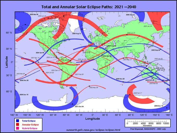 خريطة جميع كسوفات الشمس من 2021 إلى 2040.