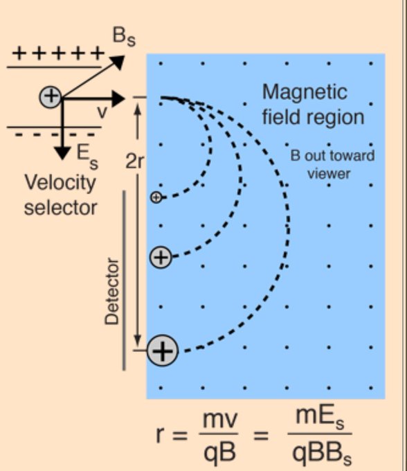 في جهاز مطياف الكتلة يتم تحديد كتلة الاجسام المشحونة اعتمادا على نصف قطر انحرافها في حقل مغناطيسي حيث أن كلما كبرت الكتلة زاد نصف قطر الانحراف.