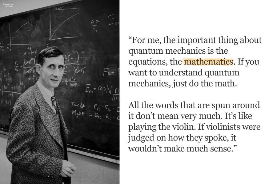 بالنسبة لي، الشيء المهم في ميكانيكا الكم هو المعادلات، الرياضيات. إذا كنت تريد أن تفهم ميكانيكا الكم، فما عليك سوى إجراء العمليات الحسابية. كل الكلمات التي تدور حوله لا تعني الكثير. إنه مثل العزف على الكمان. إذا تم الحكم على عازفي الكمان بناءً على طريقة حديثهم، فلن يكون لذلك أي معنى.