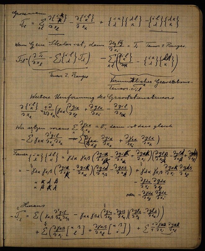 رغم الأساس الفيزيائي الصلب للنسبية العامة G.Relativity المنشورة سنة 1915 من طرف البرت أينشتاين لوصف الجاذبية في إطار النسبية الخاصة، إلا أن الرياضيات التي تستلزمها معقدة وكذلك كانت حتى لآينشتاين بنفسه. هنا مسودات معادلات بخط أينشتاين شخصيا حين كان لا يزال يطورها رياضيا.