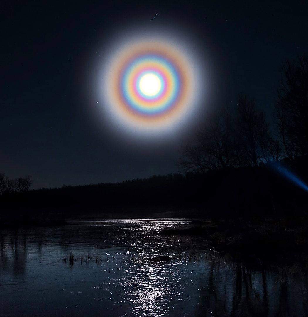 تحدث الهالة القمرية عندما يمر الضوء القادم من القمر البدر خلال البلورات الثلجية العالقة في الغلاف الجوي ، فيحدث له انكسار ، فتتشكل هذه الحلقات الجميلة حول القمر .