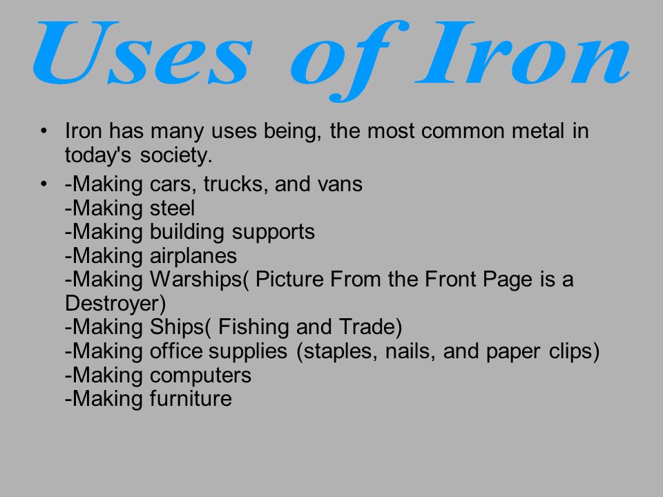 من أرخص الفلزات في العالم وأقلها كلفةً وأكثرها استخدامًا وأفضلها نفعًا,وتستخدم المنتجات الحديدية ذات القدرة العالية على التحمل،في صناعة آلاف المنتجات المستخدمة في الحياة اليومية, وتتراوح هذه المنتجات منمحابس الأوراق إلى السيارات. كما يُصنع من الحديد والفولاذ الآلات التي تساهم تقريبًا في إنتاج كل شيء نستعمله في حياتنا بما في ذلك الملابس والمنازل والطعام.