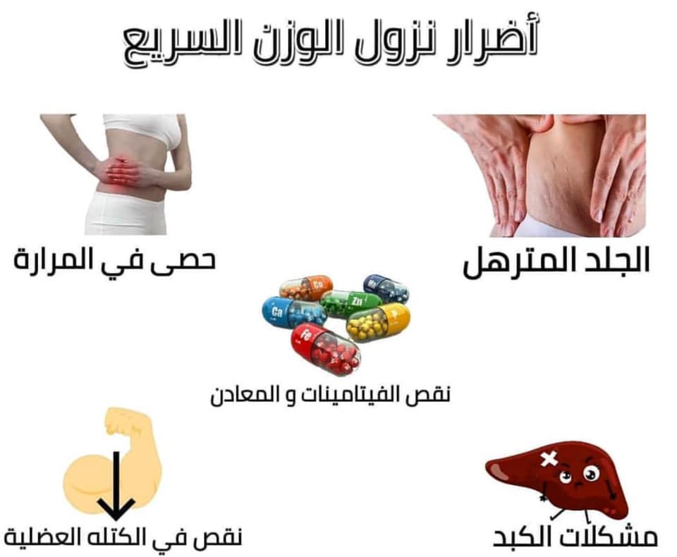 يجب عدم اتّباع أي رجيم غذائيّ قاسٍ للتخفيف من الوزن بوقتٍ قليل وبشكلٍ سريع، لأنّ ذلك يضعف الذاكرة ويؤثر سلباً على ميكانيكية الحرق الذاتي للجسم، ومن الأفضل اتباع رجيم غذائي متكامل وبحرص شديد.يسبب فقدان الوزن فى وقت قصير إلى تطور تلف الكبد، حصى المرارة أحد الآثار الجانبية الشائعة لفقدان الوزن السريع