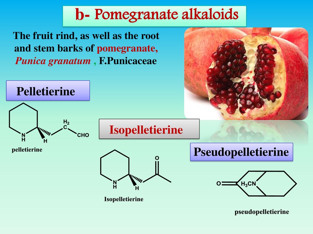 قلويد البيليتيرين Pelletierine : يحتوي الرمان على كميات كبيرة من (التانين) القابض و خاصة في قشوره الداخلية و الخارجية. كما يحتوي أيضا على مادة ( البيليتيرين) و هي تعتبر من أنجح الأدوية و أقدرها على طرد الديدان من الجسم. فمن خصائص تلك المادة إنها تؤدي إلى تحريك عصبي سريع و مستمر ما يؤدي بدوره إلى تشنج الطفيليات الموجودة في الجهاز الهضمي و بالتالي دفعها إلى خارج الجسم.