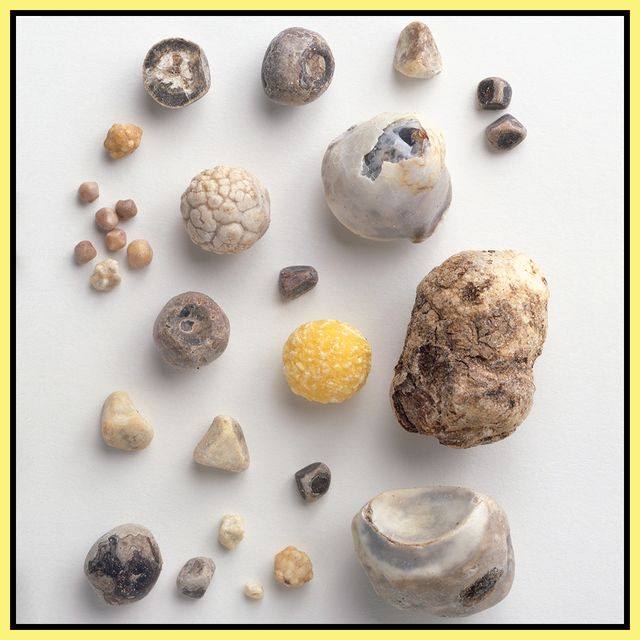 حصاة اكزالات الكالسيوم الصلبة، صعبة الطحن وتوجد بأحجام مختلفة.